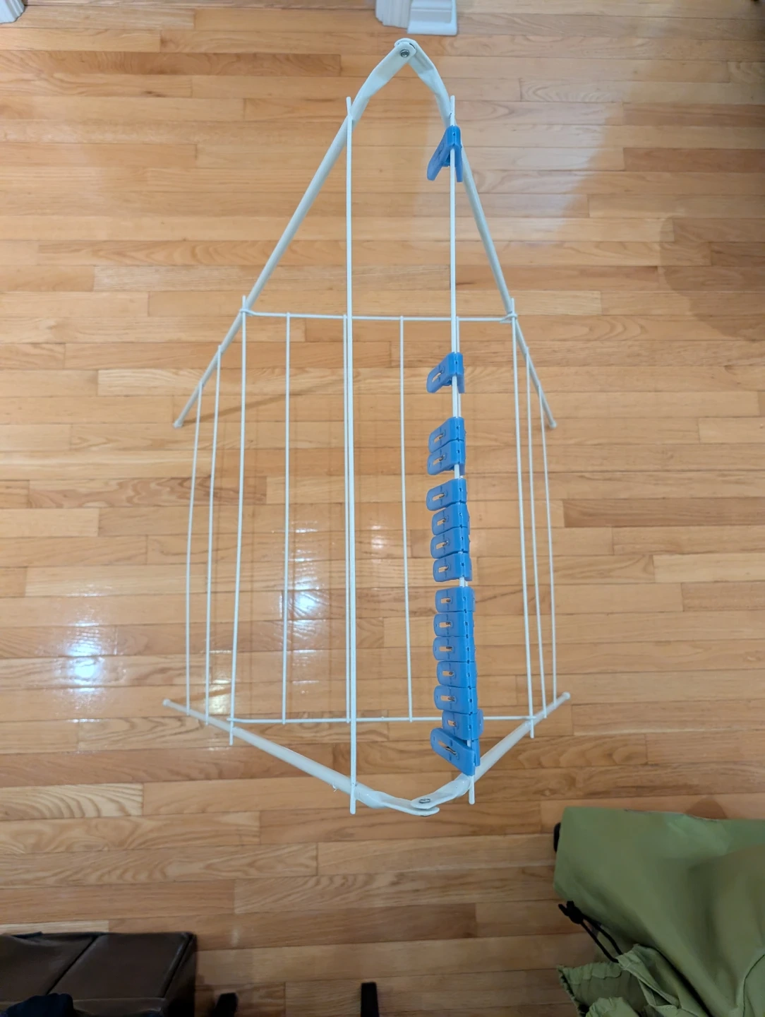 Here's a handy clothes drying rack! It's in great shape and ready to help you save on dryer costs. Perfect for small spaces and delicate items. Clothing pins INCLUDED