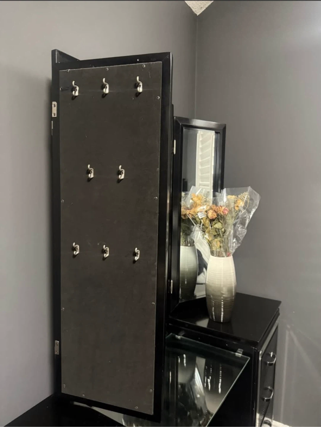 Looking to give your bedroom an upgrade? This beautiful 3-piece black set includes a dresser with a tri-panel mirror, a matching nightstand, and a comfy padded stool. On the back, the mirror has little hooks and is perfect for hanging jewelry, keys, bags, or anything you want easy access to.