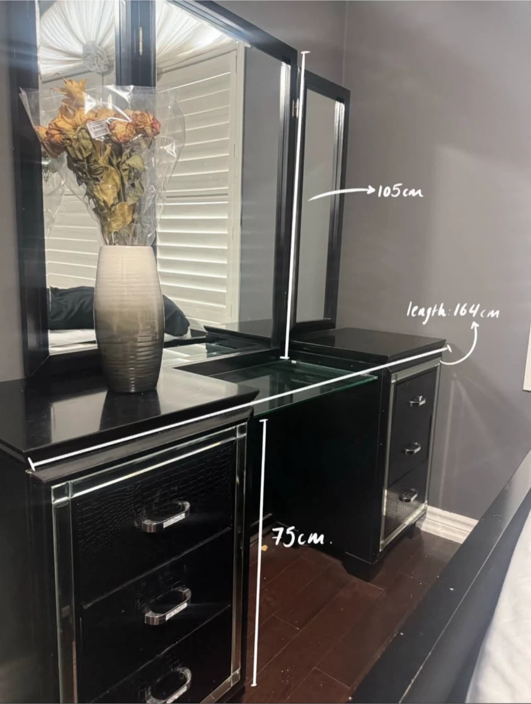 1. Vanity-style long dresser with mirror: 164 cm long x 43 cm wide x 75 cm tall (180 cm total height with mirror).