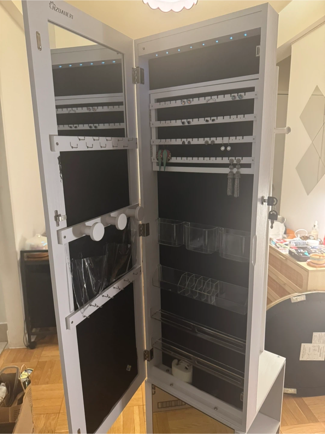 Selling a mirrored jewelry armoire! It's in great condition and ready to organize all your jewelry. It features a full-length mirror, interior LED lights, and plenty of storage for necklaces, earrings, and other accessories. Perfect for keeping your jewelry organized and easily accessible! Attached wheels for easy mobility. I love this thing but it does not fit my new space.