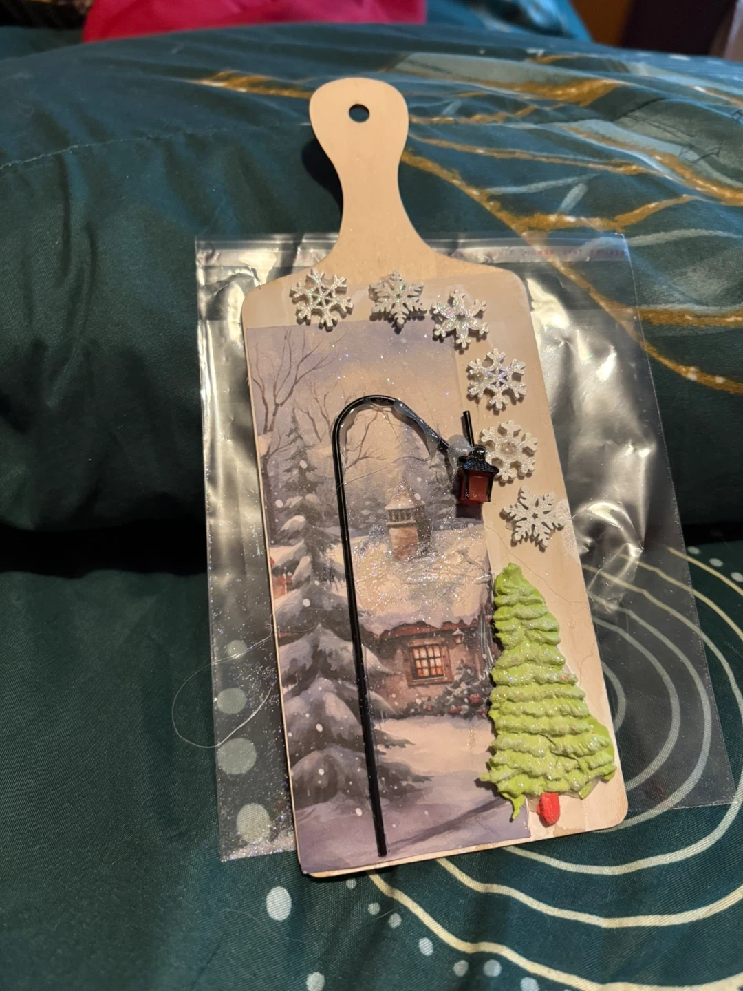 This decorative cutting board features a charming winter scene, complete with snowflakes, a cozy cottage, and a Christmas tree. It's perfect for adding a touch of seasonal cheer to your kitchen or dining area