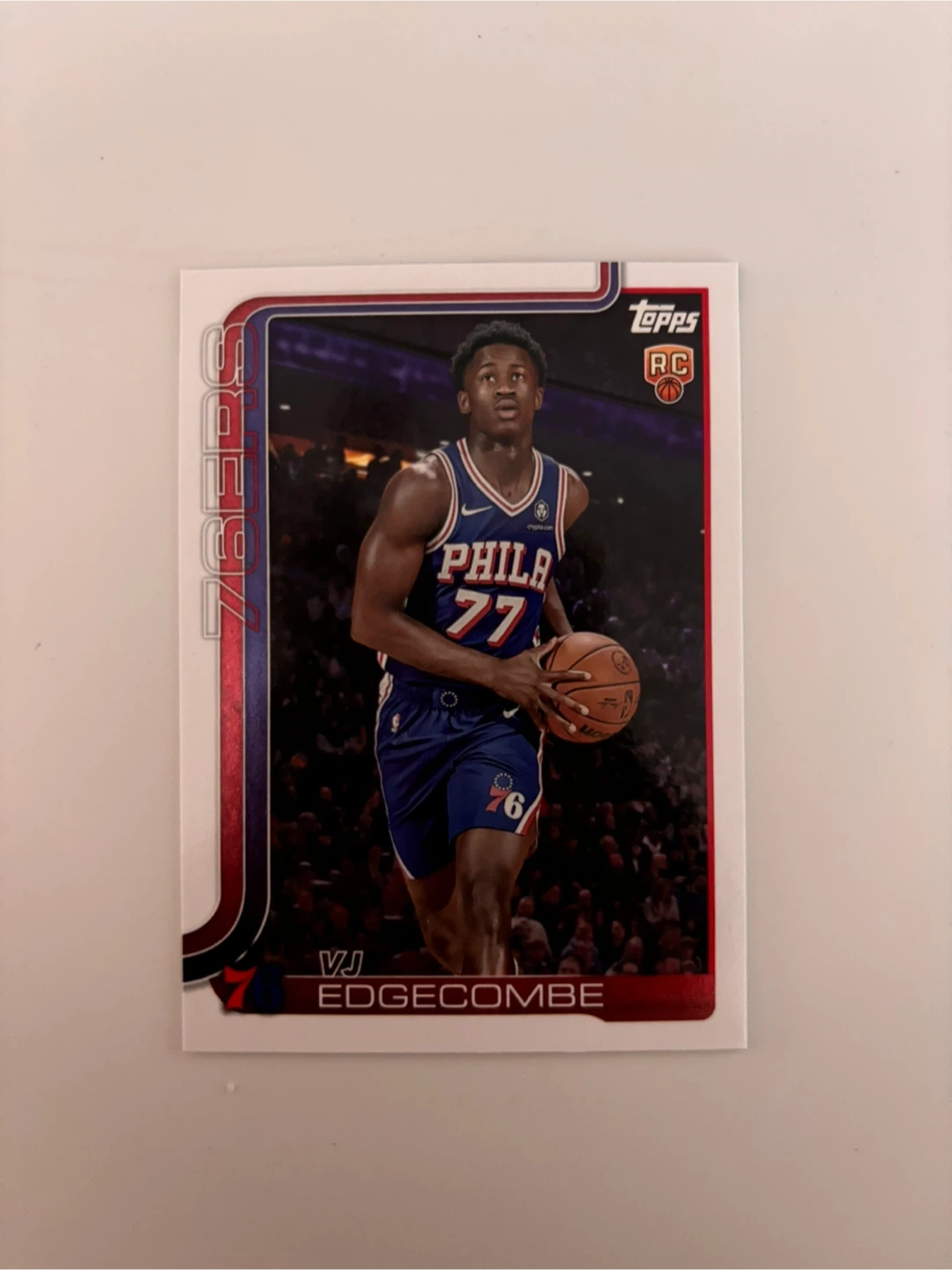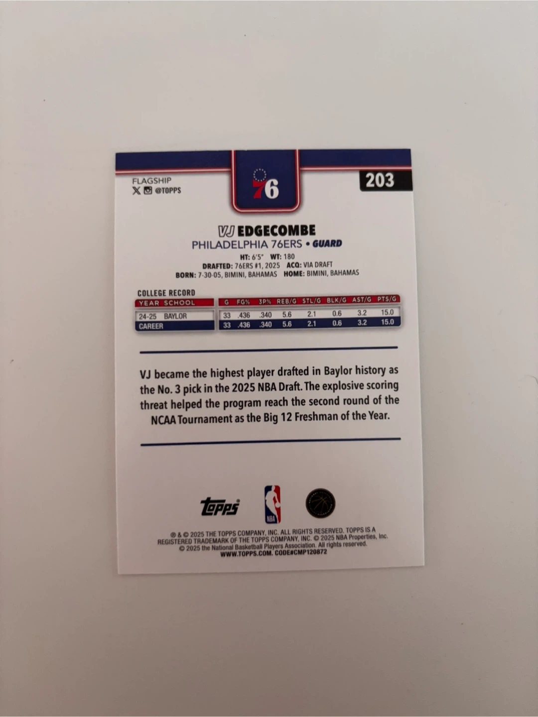 Selling a VJ Edgecombe Topps Rookie Card (RC). He was drafted to the Philadelphia 76ers as a guard. He was the No. 3 pick in the 2025 NBA Draft.