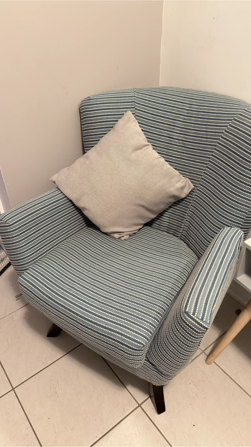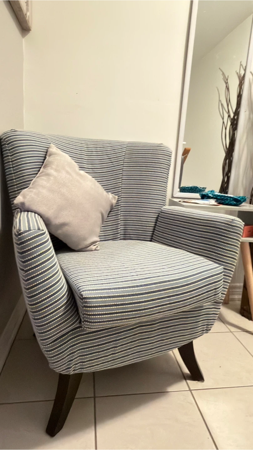 Looking to add a stylish touch to your space? I'm selling a lovely accent chair featuring a blue and white striped pattern. It comes with a comfy cushion, perfect for relaxing. The chair is in great condition and ready for a new home!