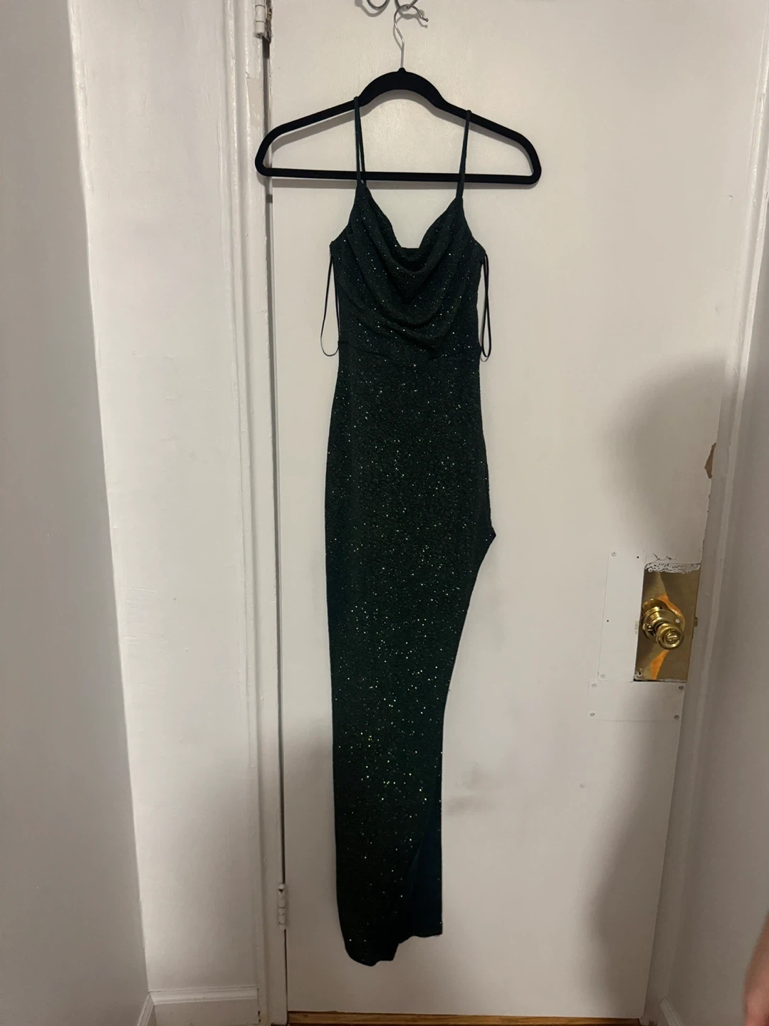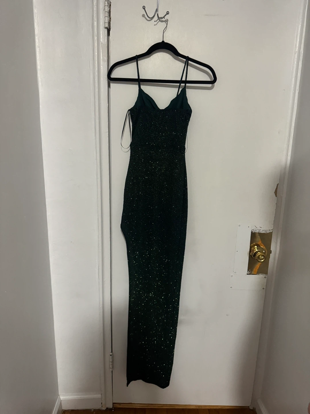 Selling a beautiful green glittery evening dress. It is a fitted dress with spaghetti straps and a slit on one side. Perfect for a special occasion!
