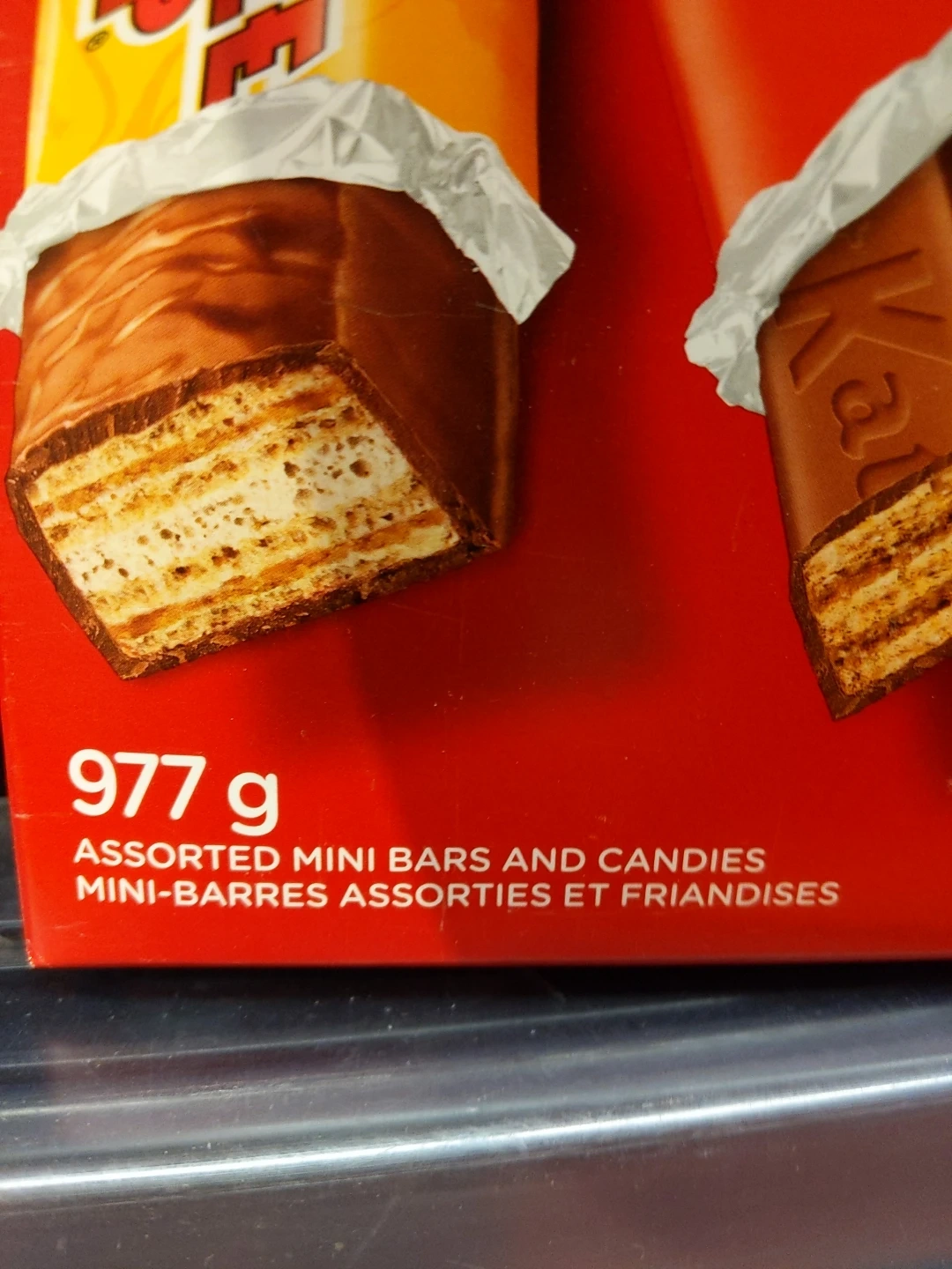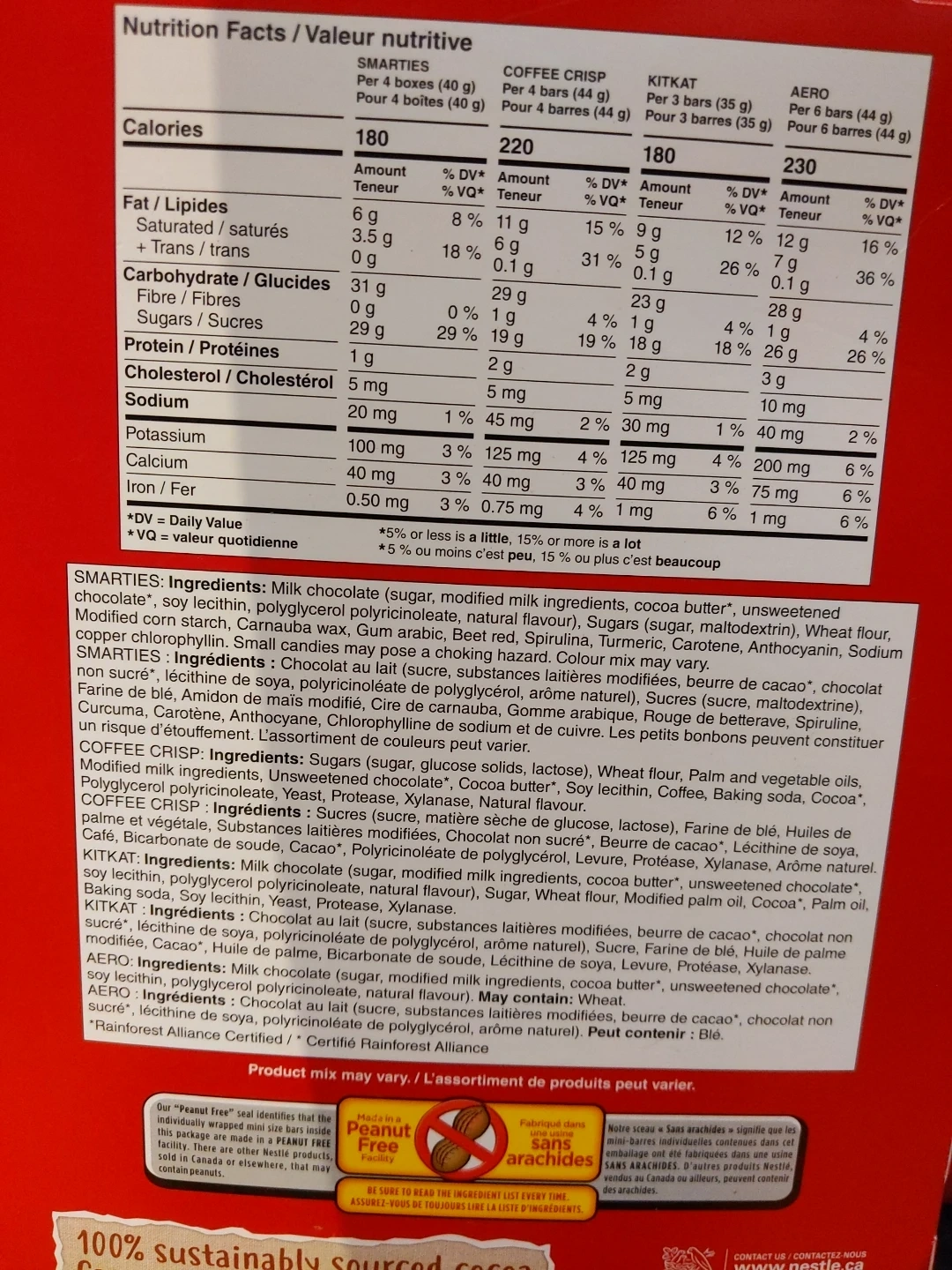 Selling a box of Nestlé 100 Assorted Mini Bars and Candies, weighing 977g! It includes Smarties, Coffee Crisp, KitKat, and Aero bars. Perfect for sharing or enjoying yourself