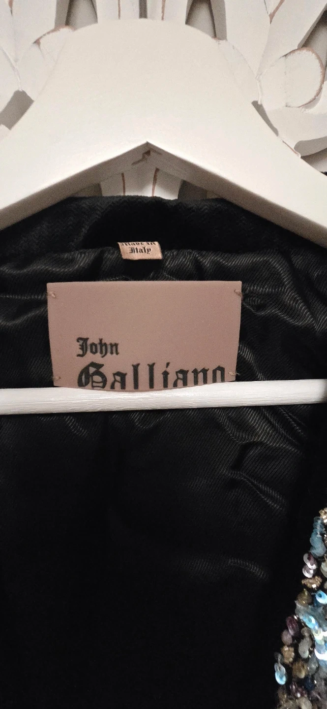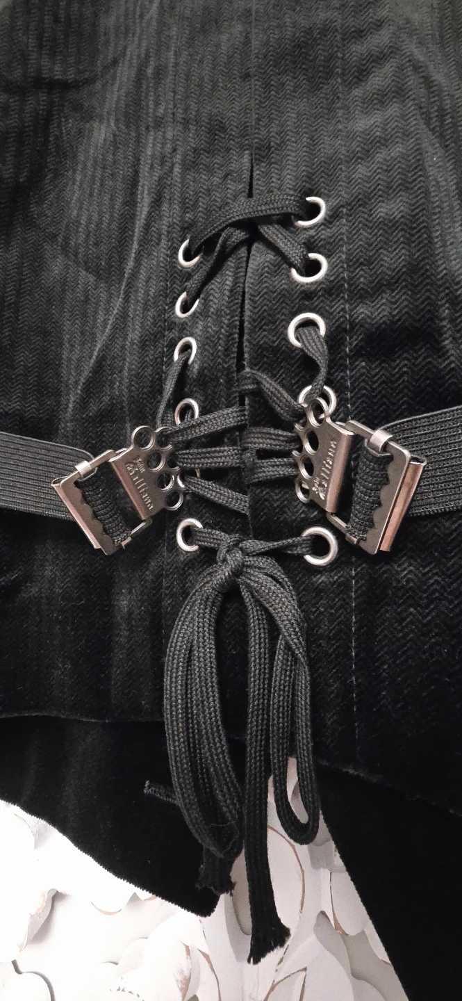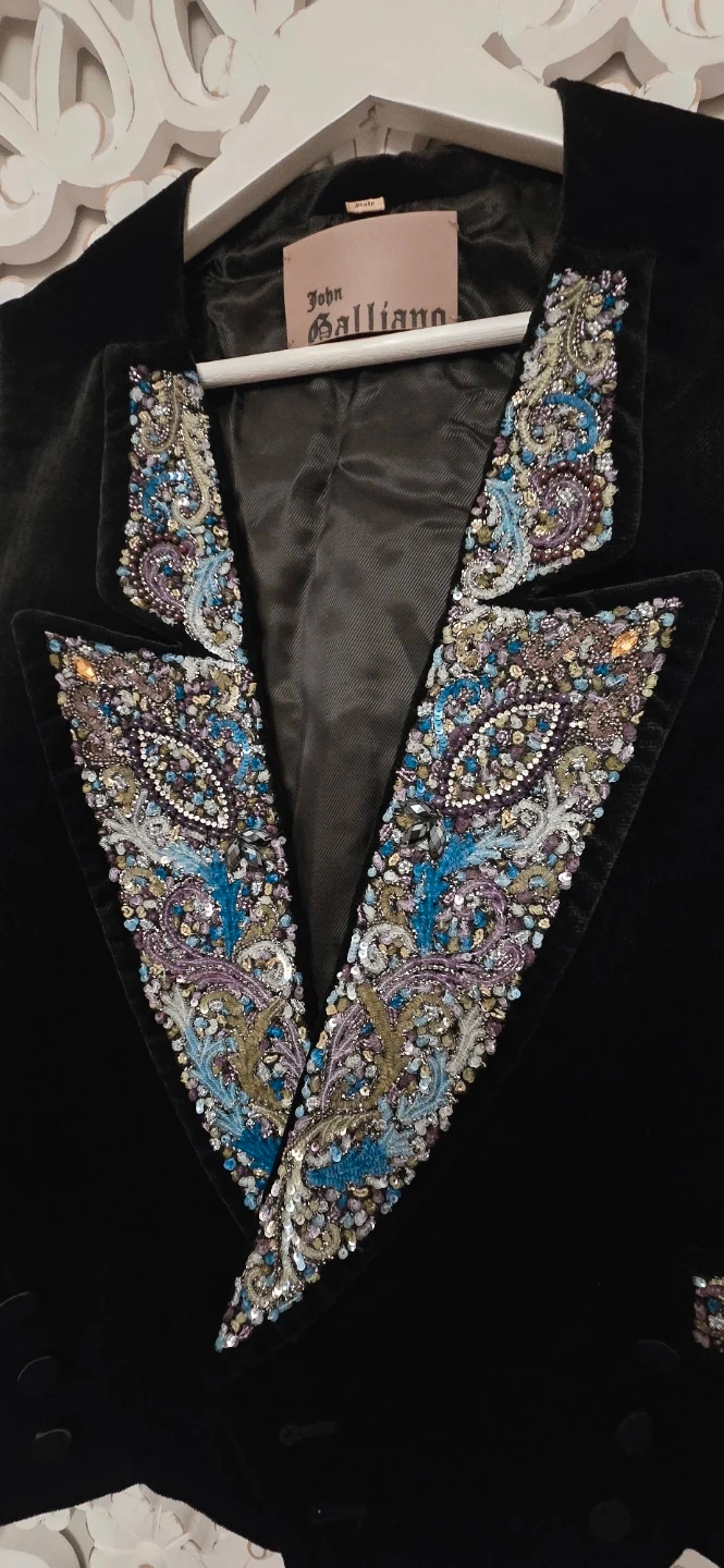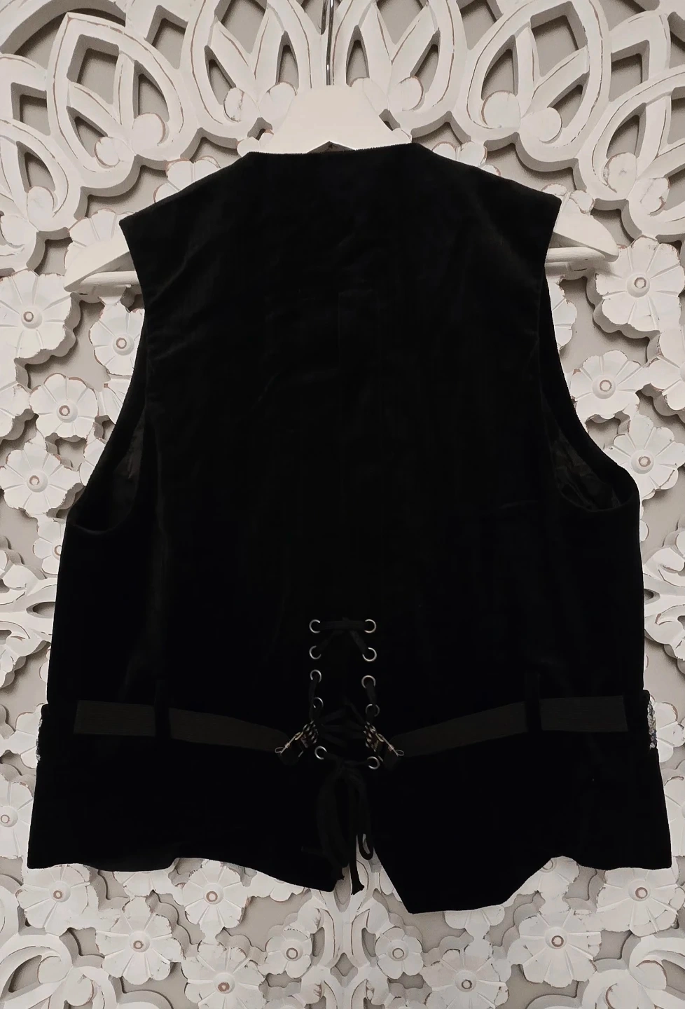 Selling a beautiful John Galliano vest made of black velvet. The vest features stunning embellishments and a unique lace-up detail at the back.