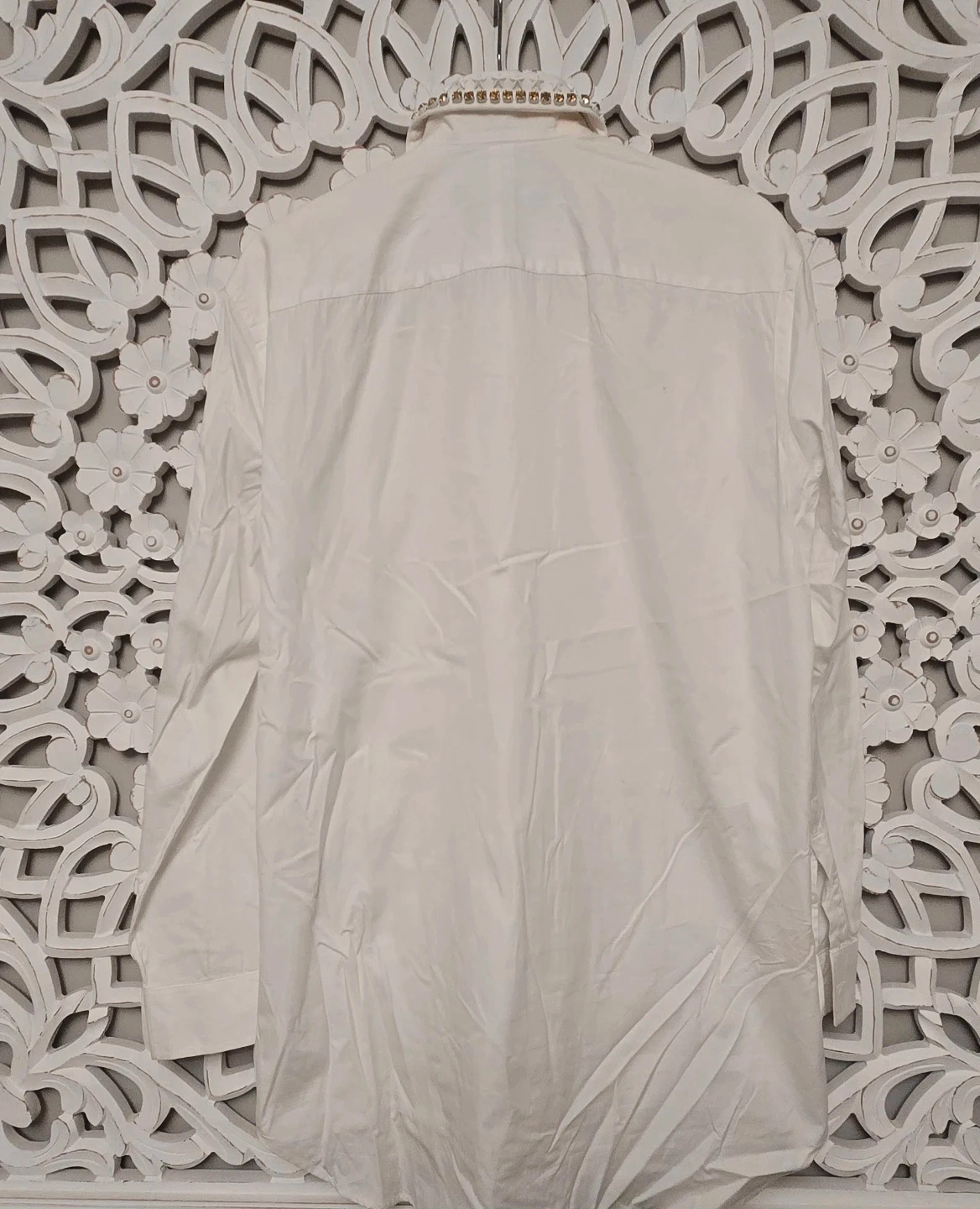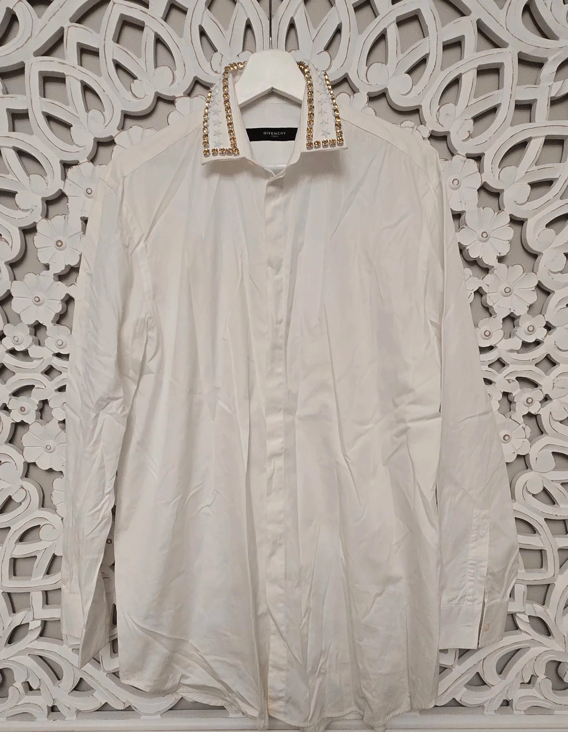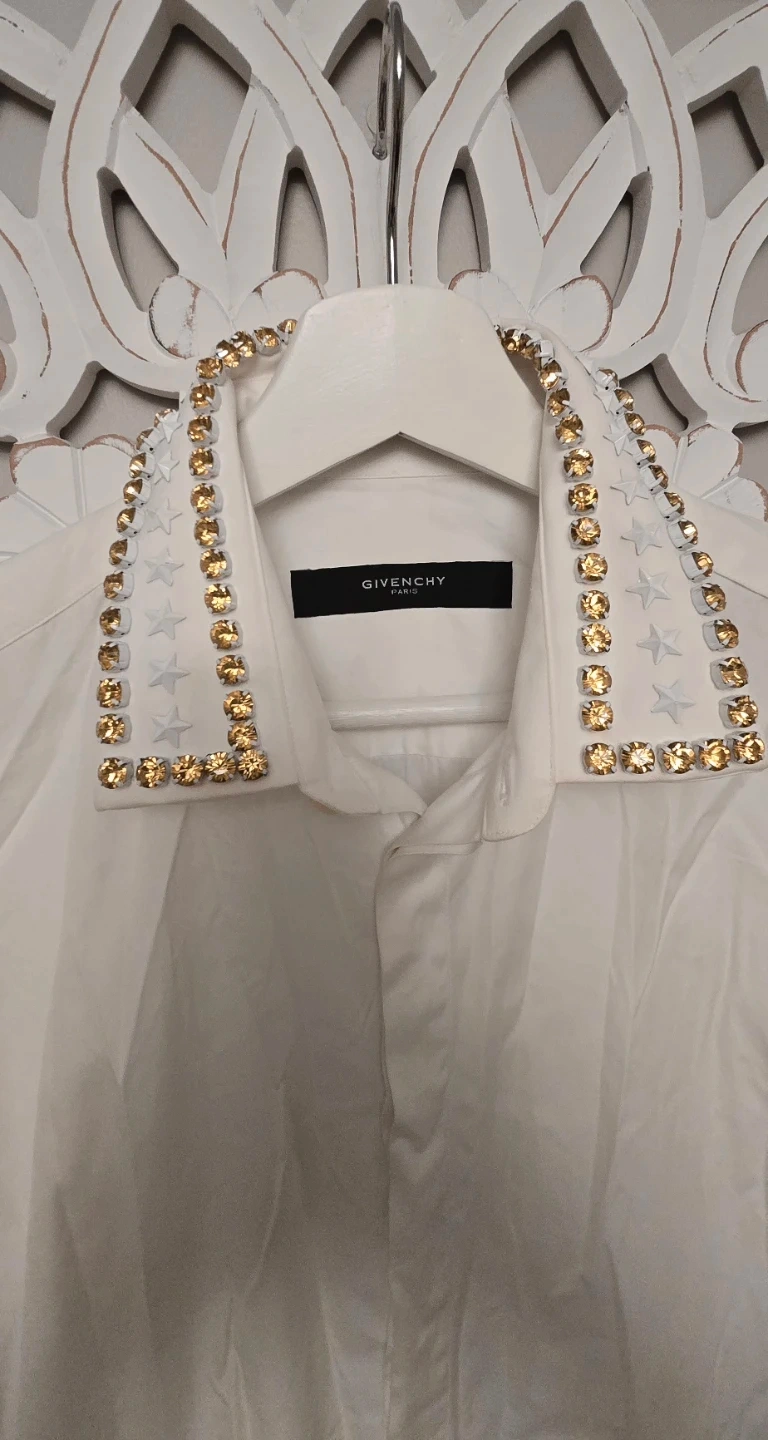 Selling a stylish Givenchy white shirt with a unique embellished collar! It's in great condition and ready for a new home. The shirt features a classic button-down design with eye-catching gold and star embellishments around the collar