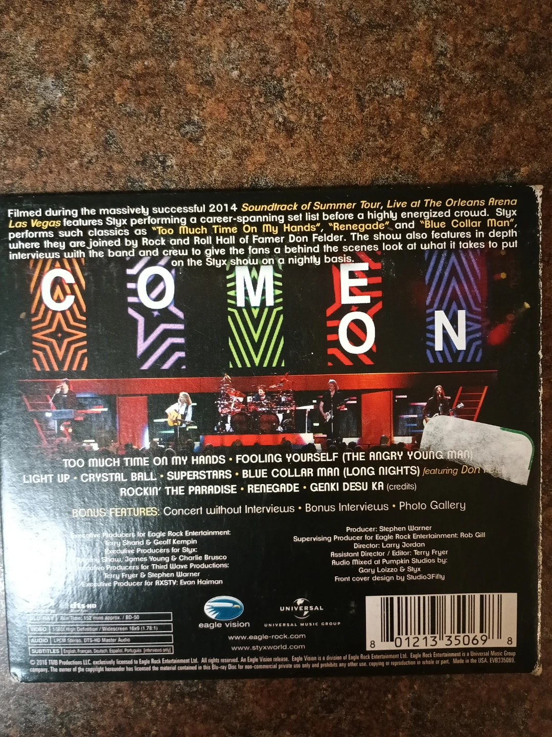 Selling a Styx - Live at The Orleans Arena Blu-ray disc. Filmed during the massively successful 2014 Soundtrack of Summer Tour, Live at The Orleans Arena Las Vegas features Styx performing a career-spanning set list before a highly energized crowd. The show also features interviews with the band and crew to give the fans a behind the scenes look at what it takes to put on the Styx show on a nightly basis