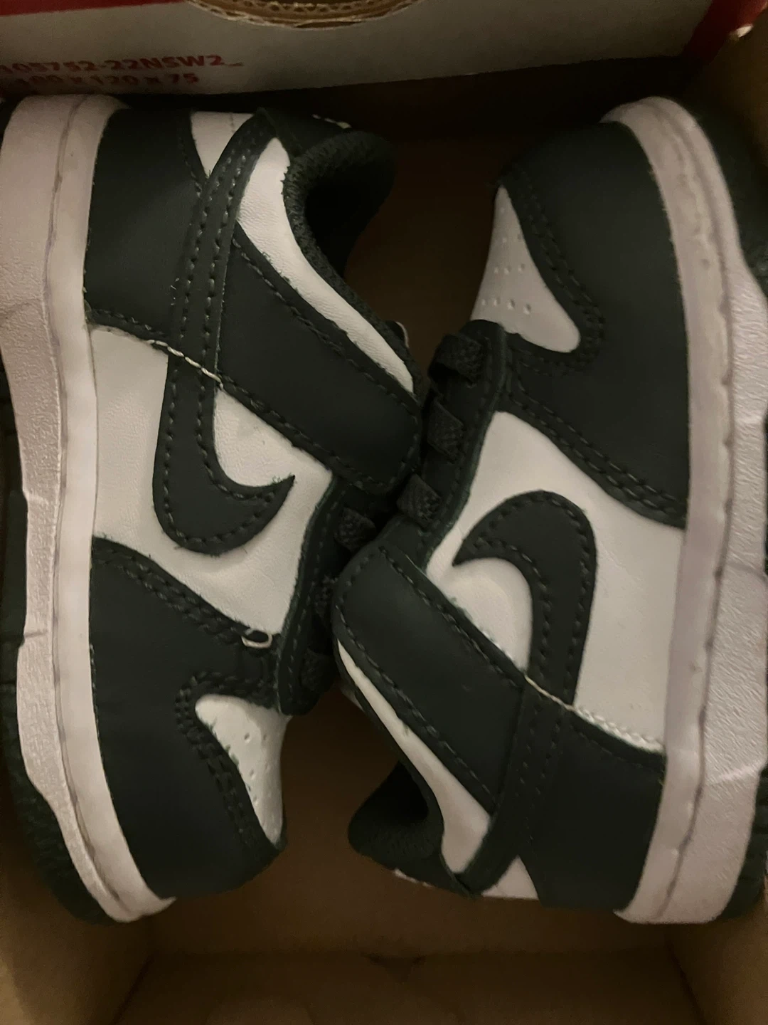 Selling a pair of Nike Dunk Low (TDE) in white and vintage green. They are a size 5C (US). Comes with the original box!