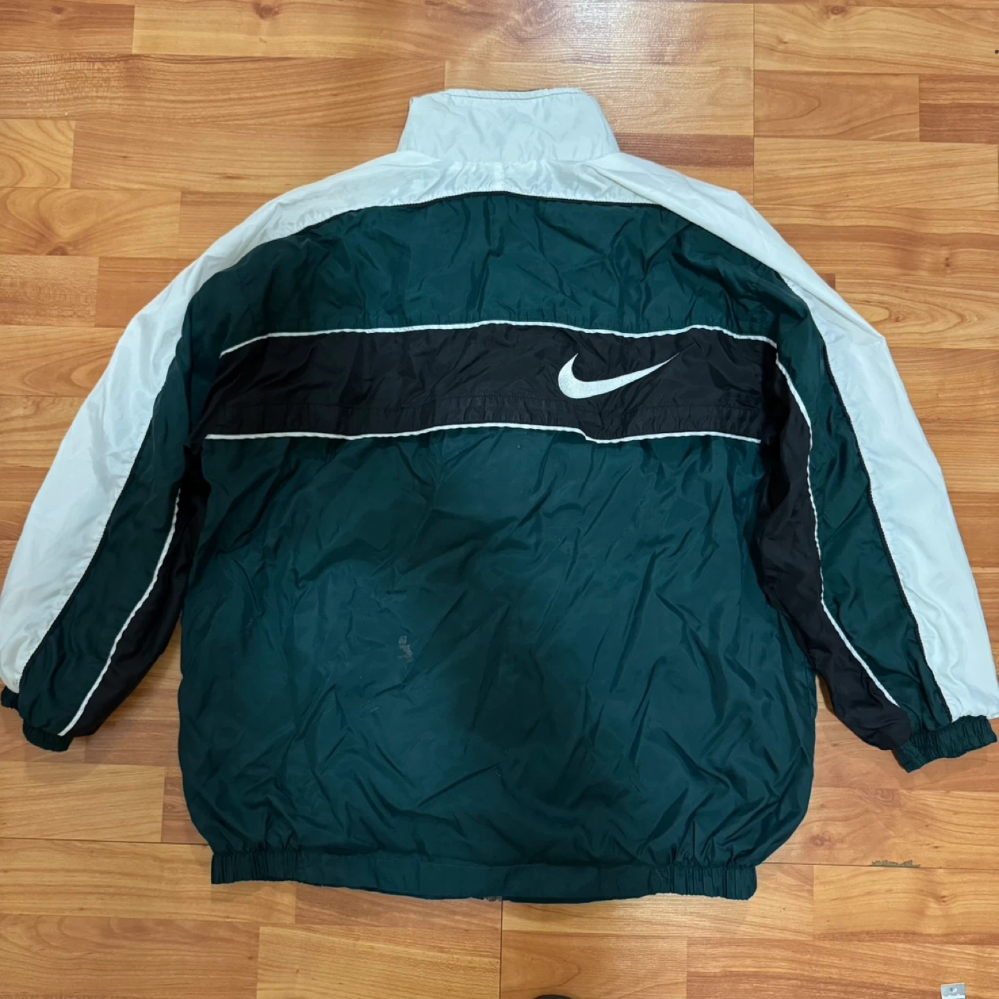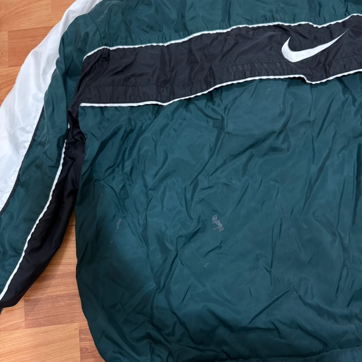 Selling a Nike windbreaker jacket. Fits women Medium or Men small. Check listing photos for measurements. It features a stylish green, black, and white colour block design. DM for more info.