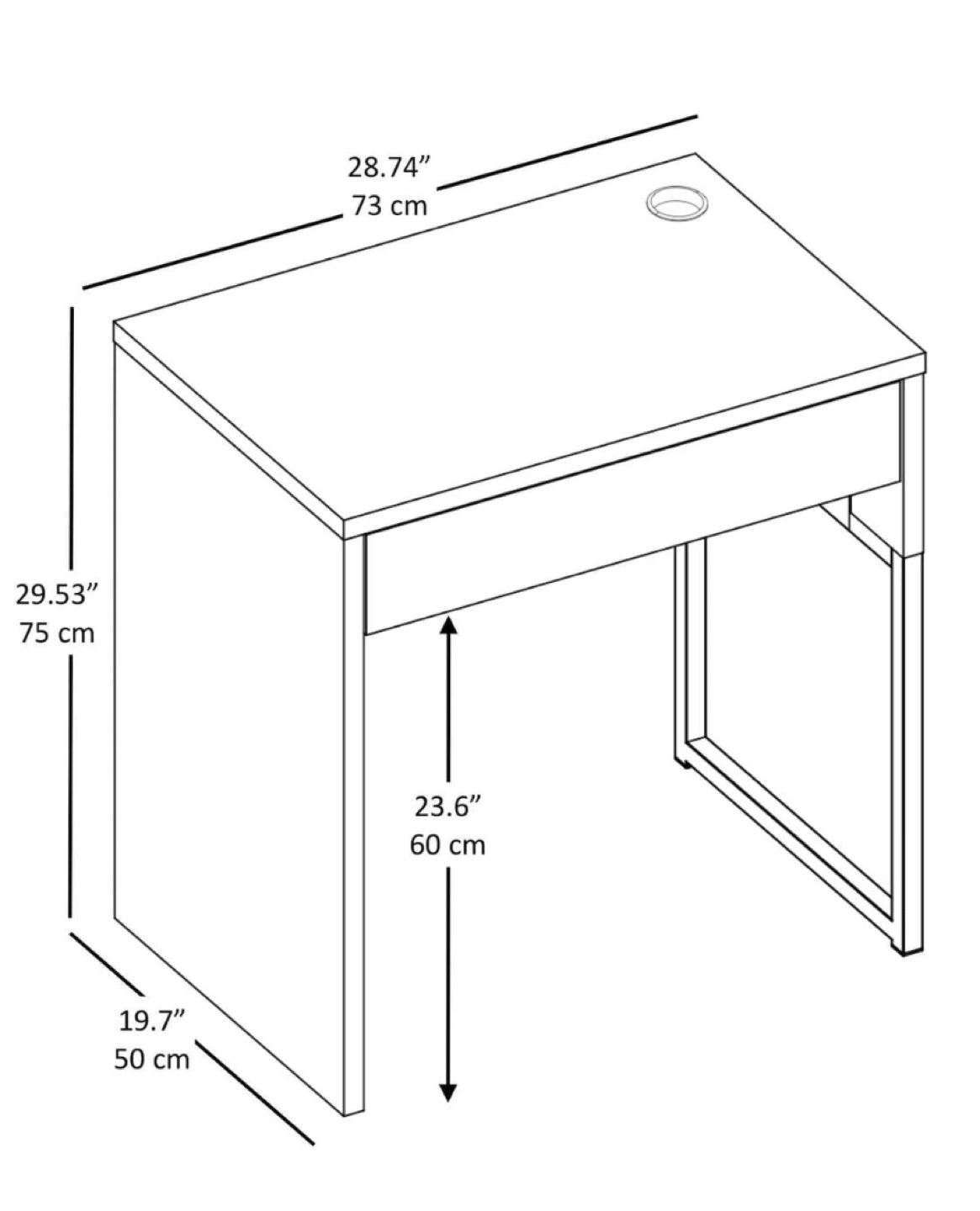 The dimensions are 73cm x 50cm, and the height is 75cm. Perfect for a small workspace or student