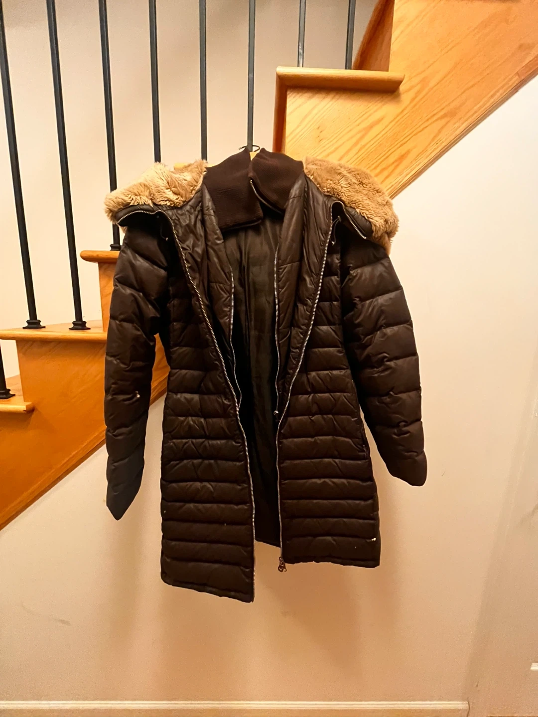 Cozy Tommy Hilfiger down-filled puffer jacket, perfect for chilly days! The jacket features a faux fur-trimmed hood and a stylish belted waist. It's in great condition and ready to keep you warm this winter