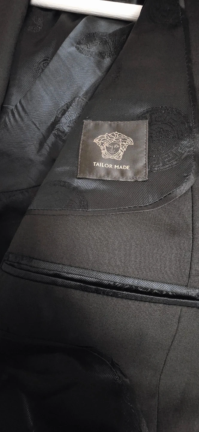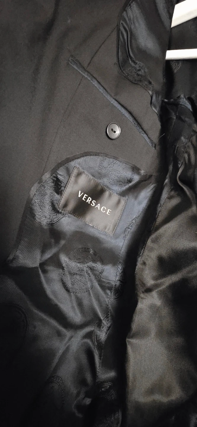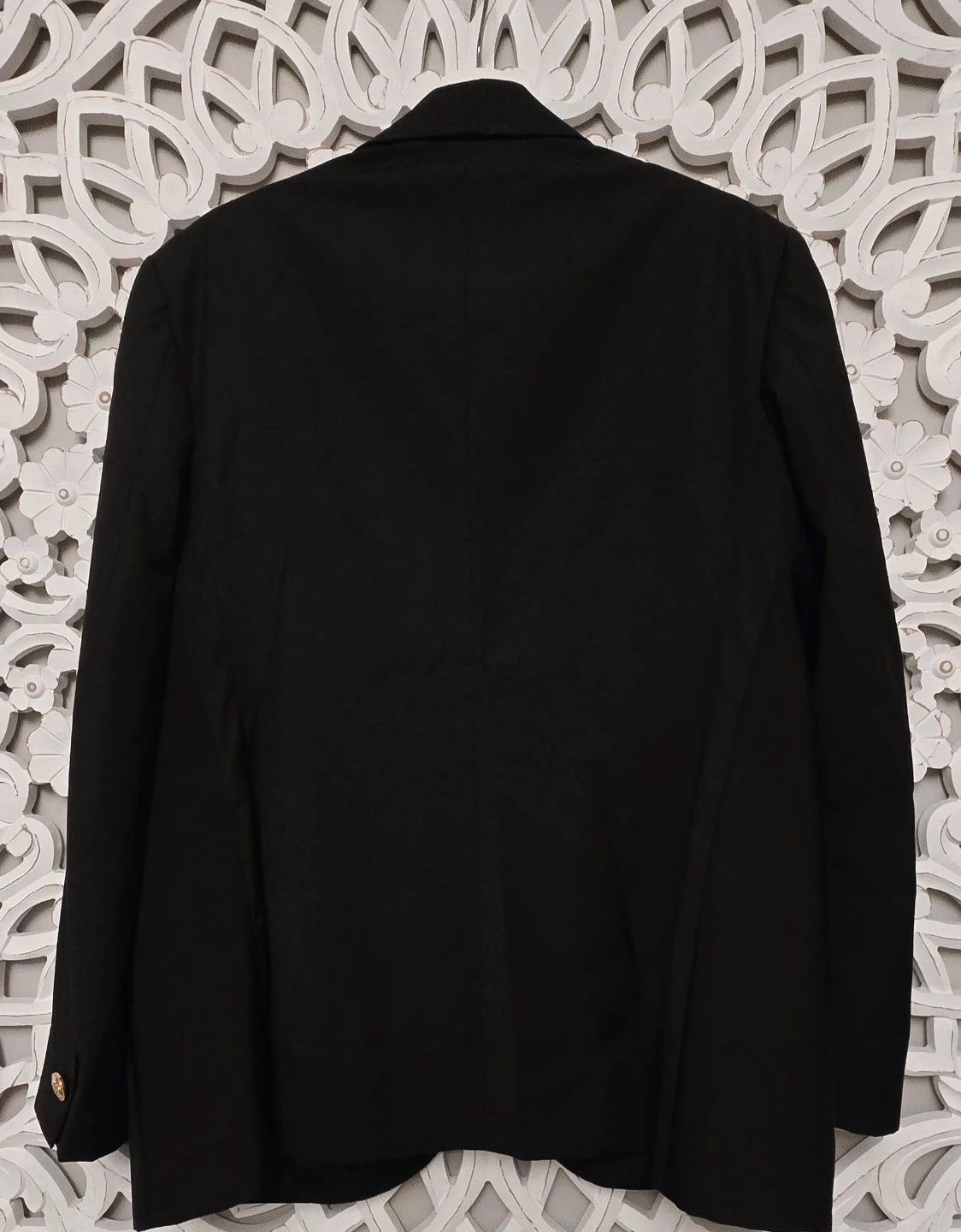 Selling a stylish Versace blazer in black. The blazer has a unique design with decorative embellishments. It's a tailor-made piece