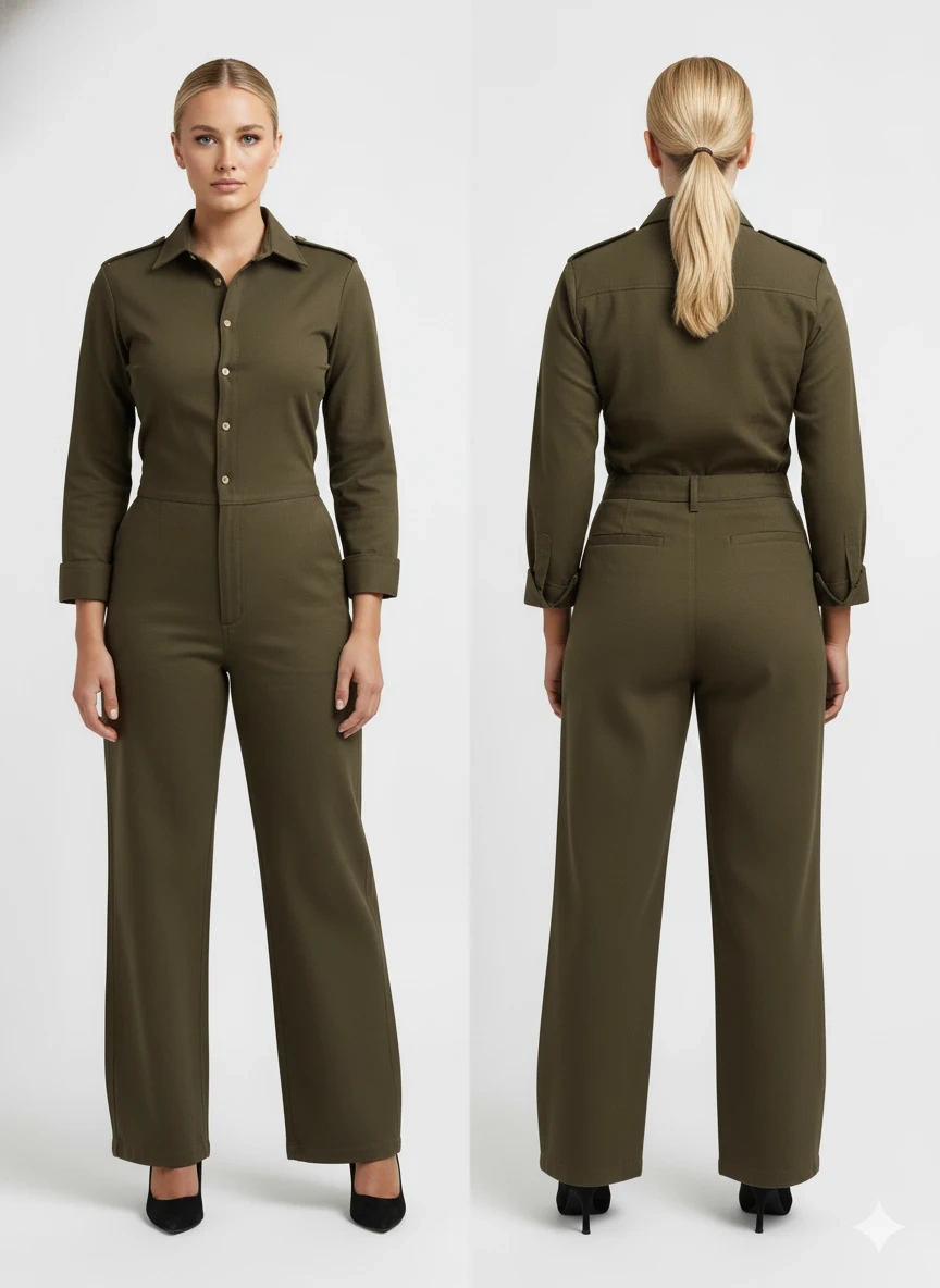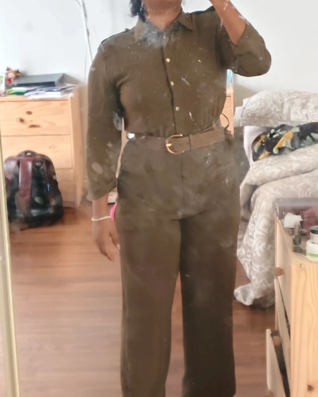 Selling an olive green Zara jumpsuit. It's a stylish and comfortable piece that could be dressed up or down. Great for a casual day out or a night on the town!
