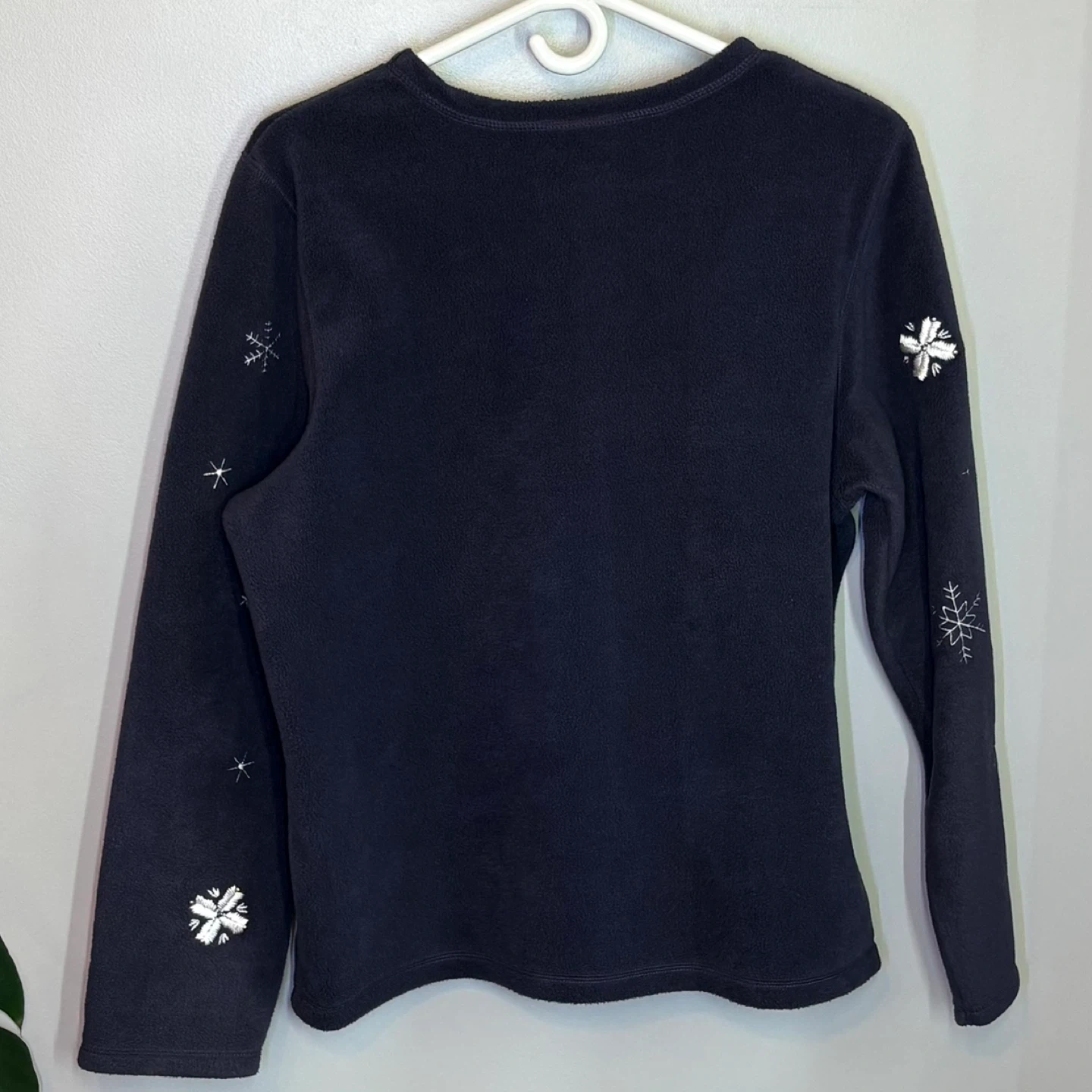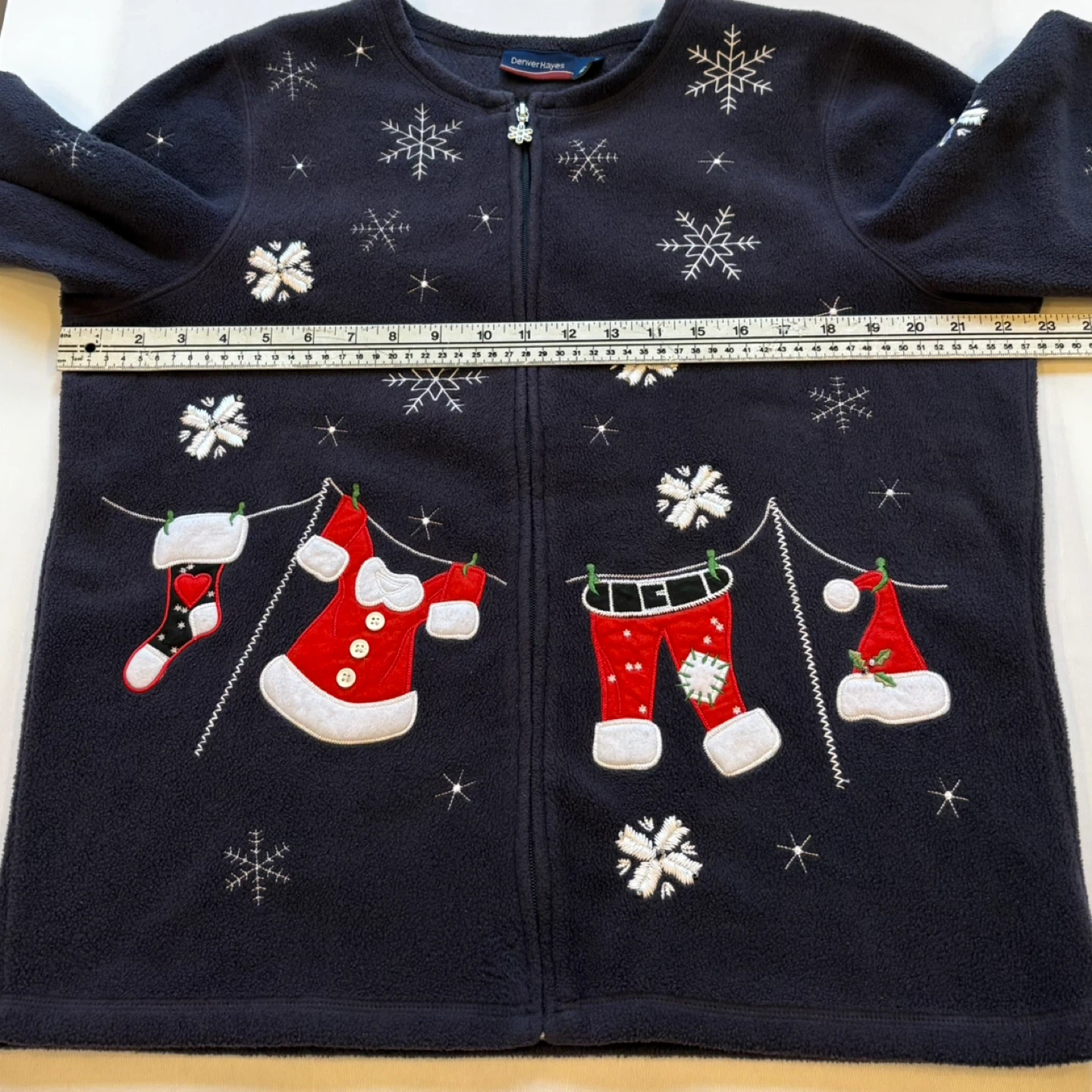 This fun, festive Denver Hayes full-zip fleece cardigan is perfect for the holiday season. The dark navy blue sweater features charming embroidered snowflakes and a fun appliqué scene of Santa's laundry (including his coat, pants, and hat, plus a stocking) hanging on a clothesline, surrounded by delicate silver snowflake embroidery and beading. Made from soft polyester fleece, this comfortable cardigan in size XL is ideal for Christmas parties, casual festive wear, or as a fun "ugly sweater" alternative. It features a full zipper closure with a snowflake zipper pull charm.