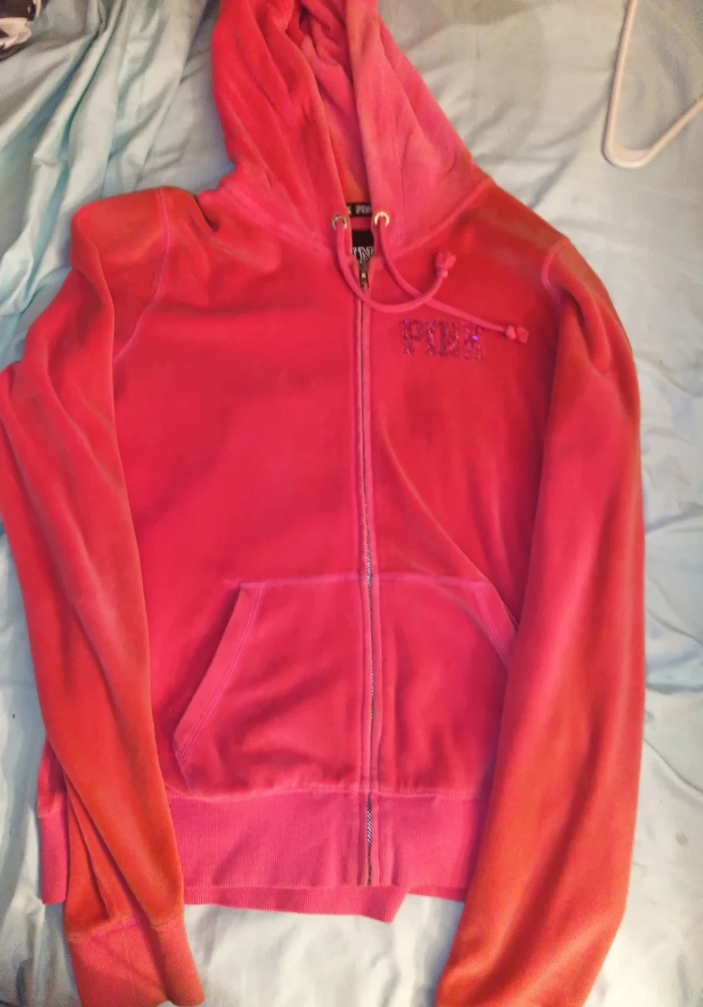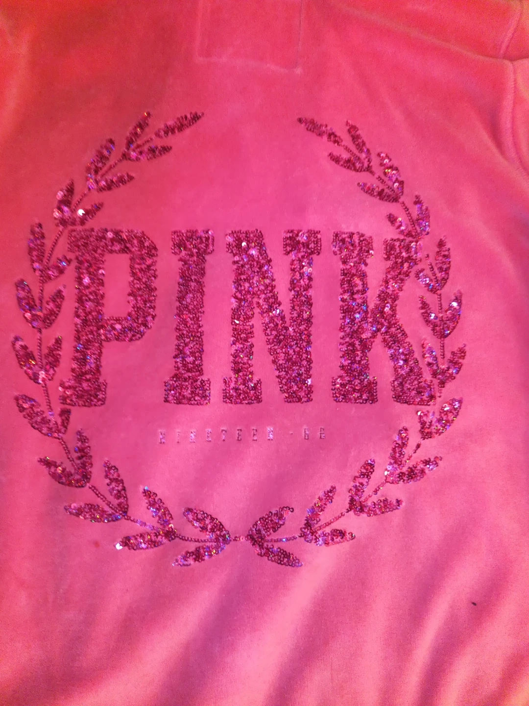 Selling a cute PINK Victoria's Secret full-zip hoodie in a vibrant pink color! It's a size large and features the PINK logo filled with sequins on the front and back. The hoodie has a soft, comfortable feel, perfect for everyday wear