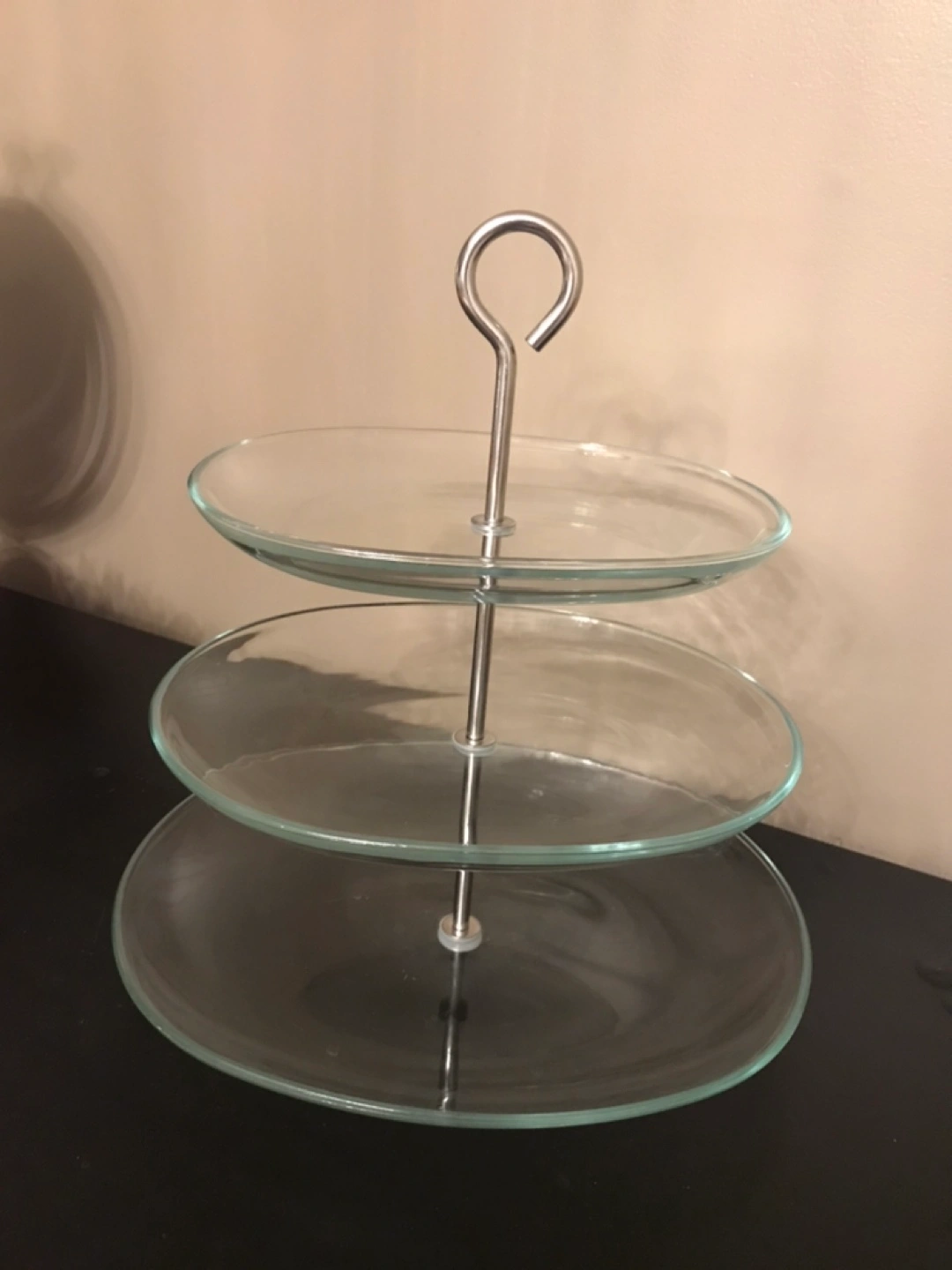 Selling a lovely 3-tier glassserving stand! It's in great shape and would be perfect for displaying desserts or appetizers at your next gathering.
