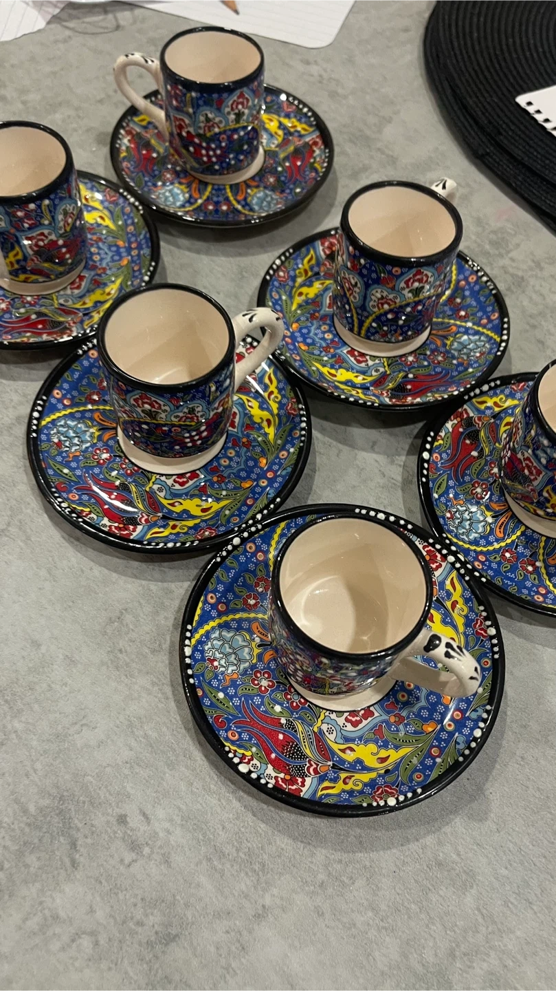 Selling a beautiful set of hand-painted Turkish coffee cups and saucers! These are so vibrant and unique, perfect for adding a touch of charm to your coffee routine or as a lovely gift for someone special