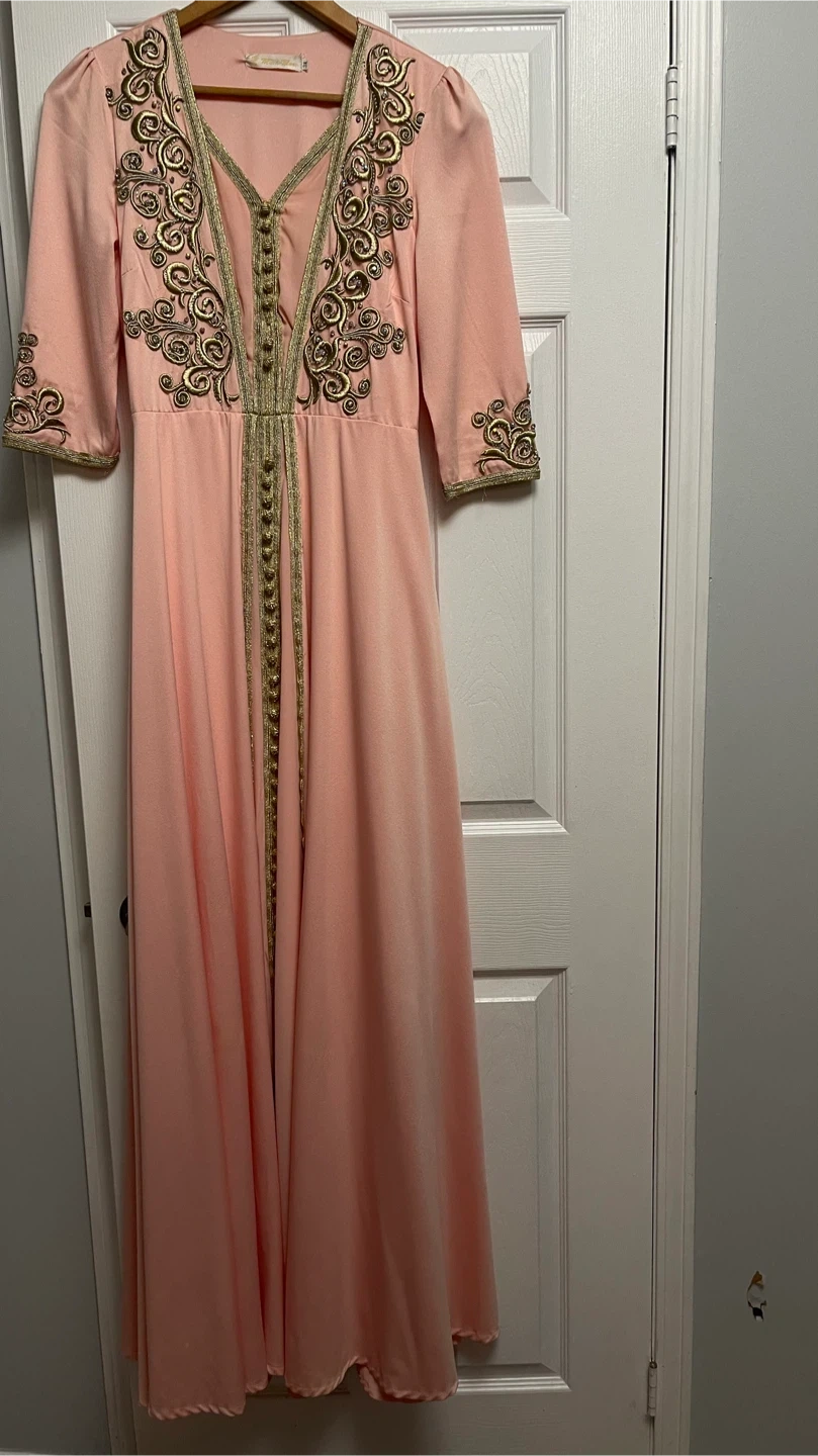 Beautiful pink Moroccan caftan with gold embroidery! It's in great condition and ready for a new home. The fabric is soft and comfortable, perfect for special occasions or just feeling fancy around the house
