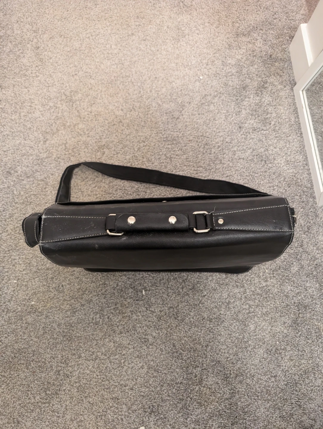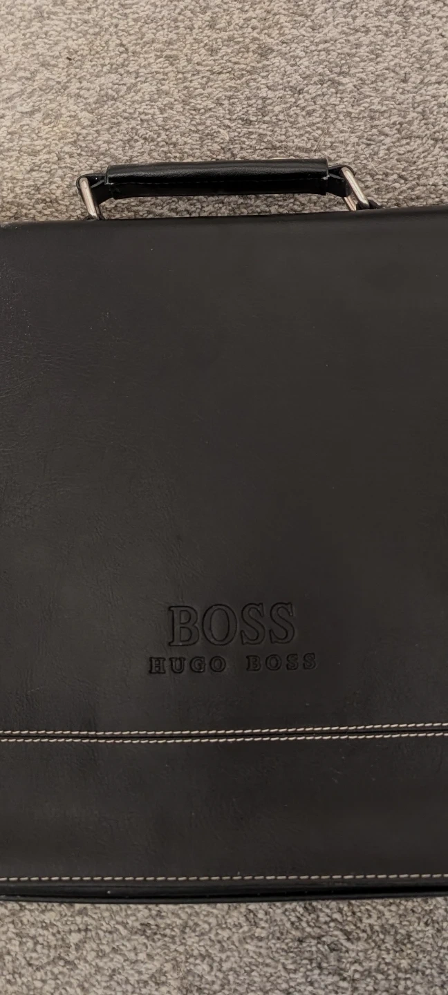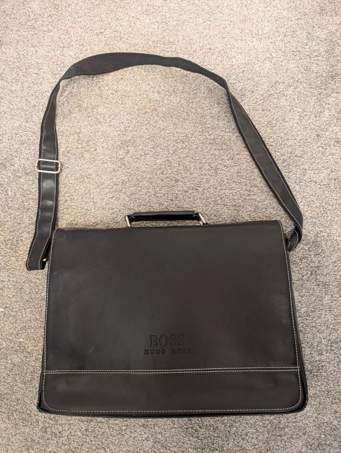 Selling a Hugo Boss briefcase in black leather. It's in great condition and perfect for carrying your laptop and documents to work or school. It features a handle and a shoulder strap for easy carrying.