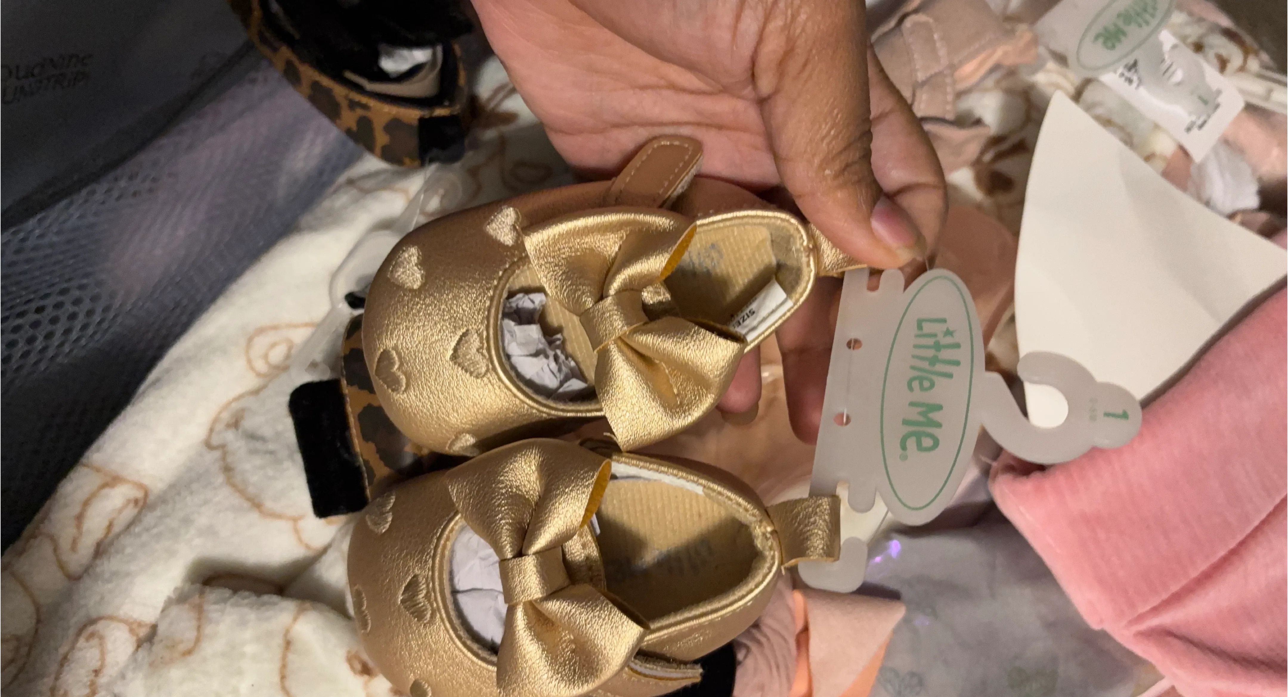 These adorable gold baby shoes from Little Me are brand new with tags! They're a size 1 and feature a sweet little bow. Perfect for your little one!