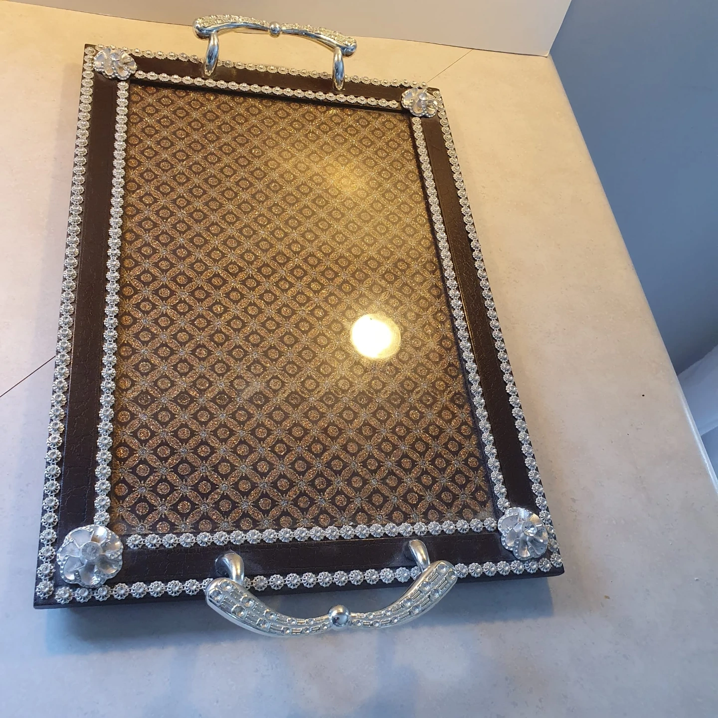 Selling a decorative serving tray with silver handles and a patterned surface. It has a nice, elegant touch with the rhinestone detailing around the edges. Perfect for adding a bit of sparkle to your serving needs!