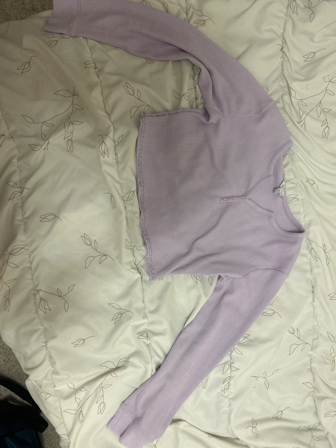 This is a long sleeve top in a soft purple color. It has a waffle texture and a three-button detail at the neckline. It's in great condition and ready for a new home!