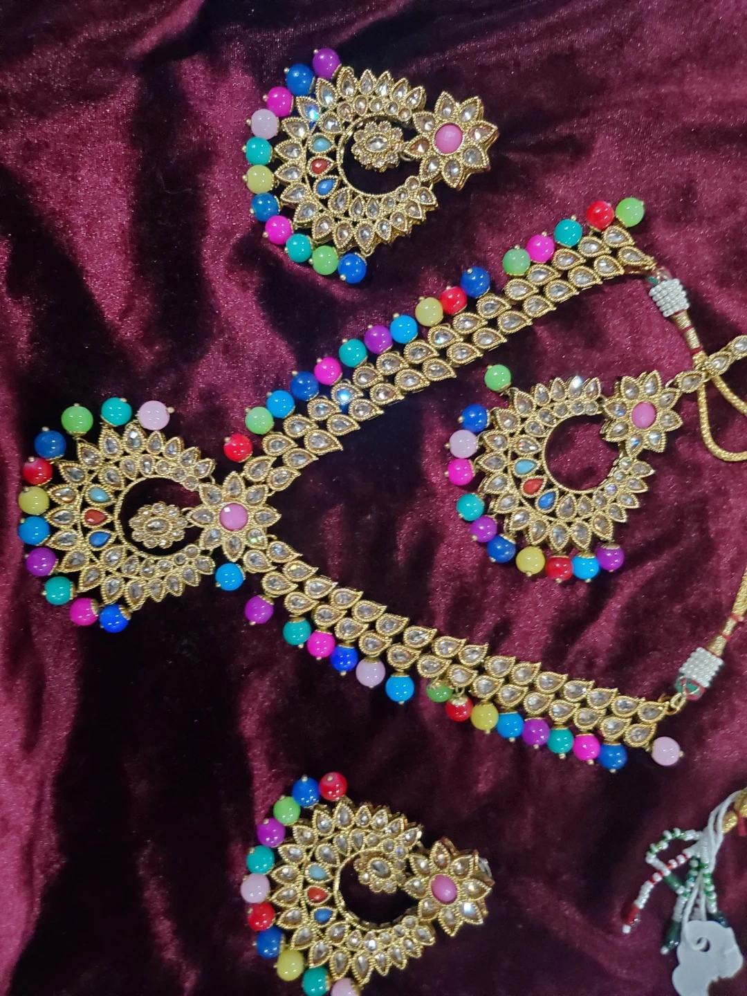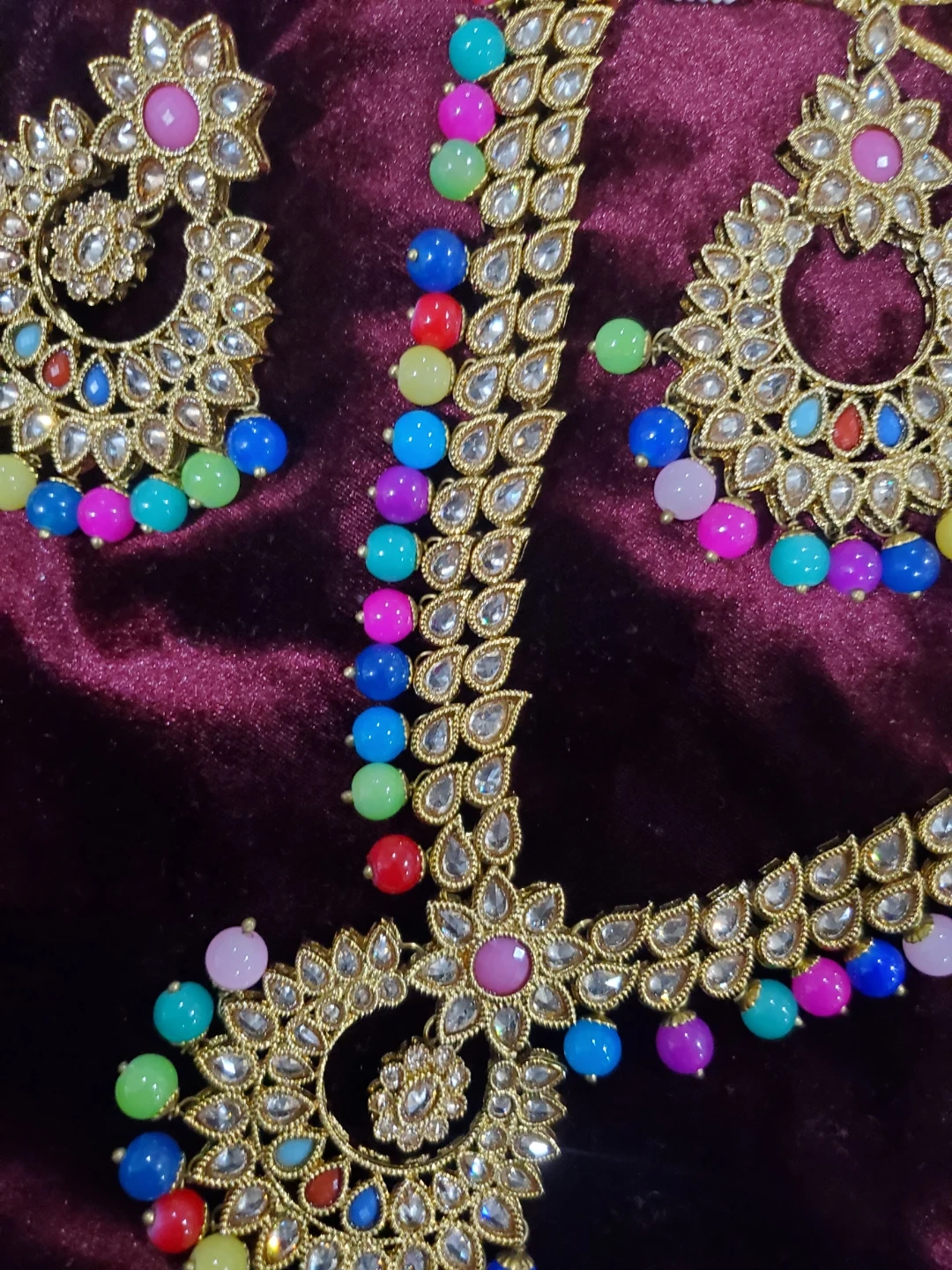 Beautiful necklace and earring set in a gold tone, adorned with colourful beads and clear rhinestones. A lovely addition to any jewellery collection!