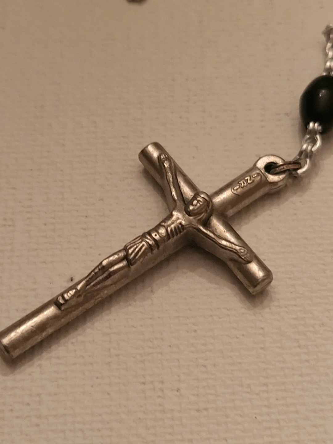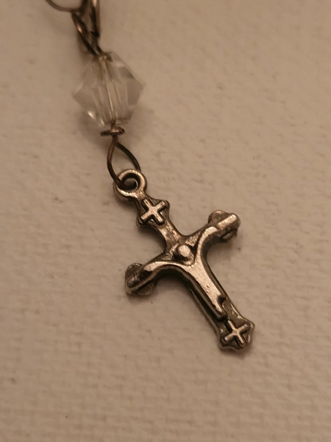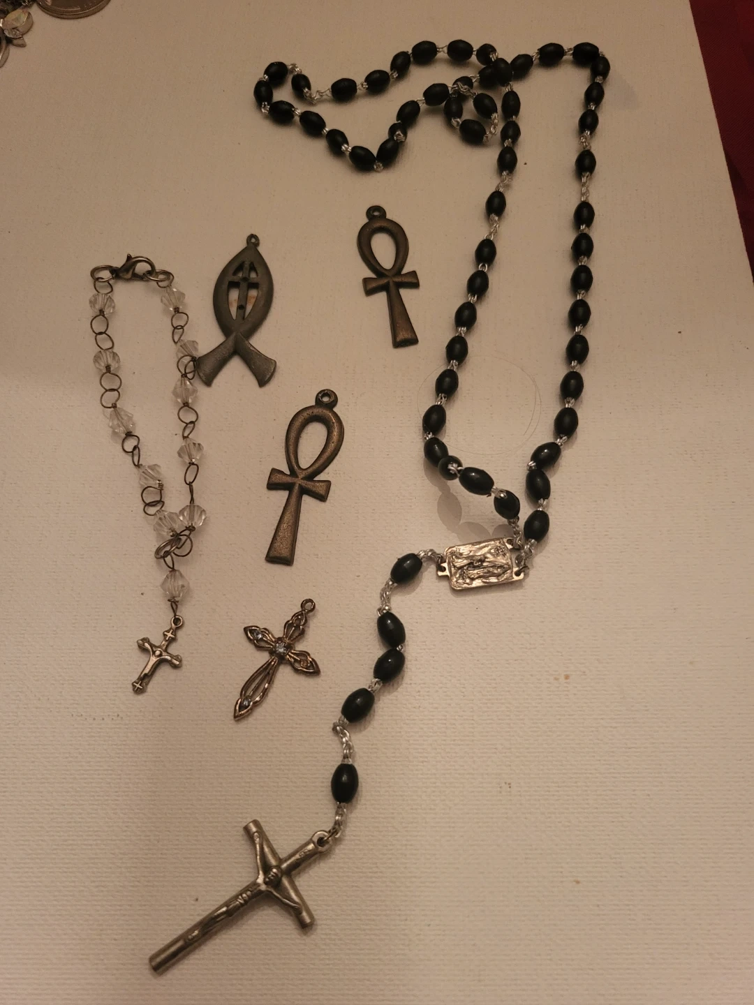 A collection of religious pendants and rosary beads. Includes a rosary with black beads and silver-toned metal links, various cross pendants, and an ankh pendant. Great for crafting or personal use. Selling as a set of 6.