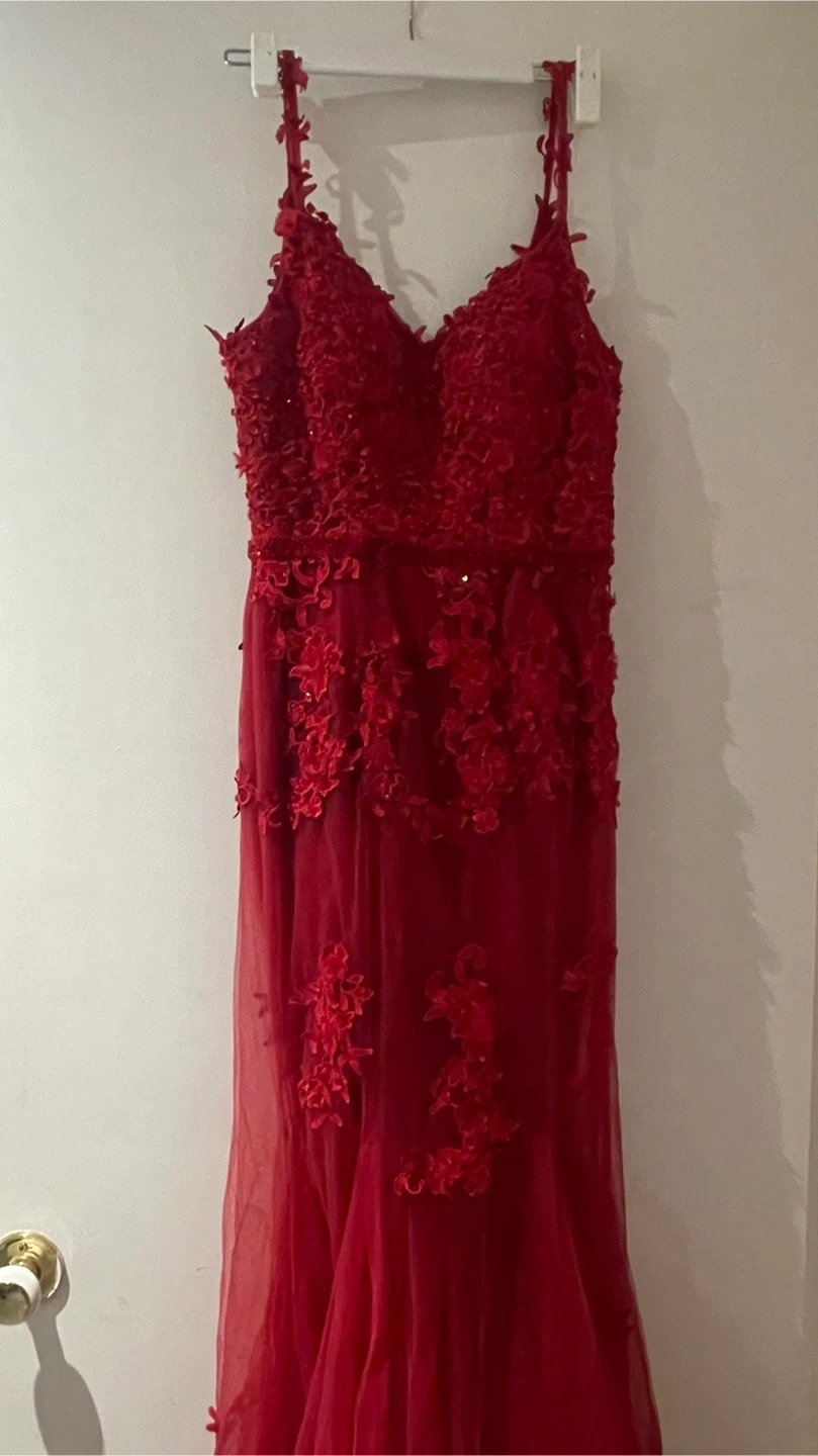 Selling a beautiful red formal gown! It features intricate floral detailing (lace & 3D details) and a flattering silhouette. Perfect for a special occasion!