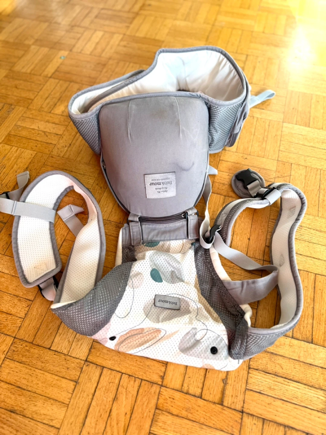 Selling a Bébé Confort baby carrier in great condition! It features a stylish design with grey and white accents, perfect for keeping your little one close and comfortable while you're on the go