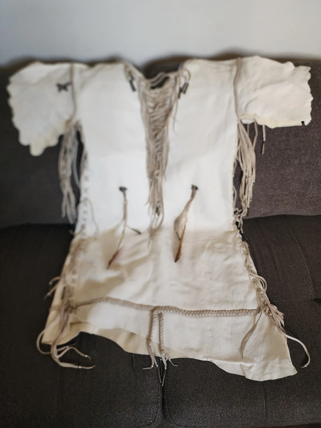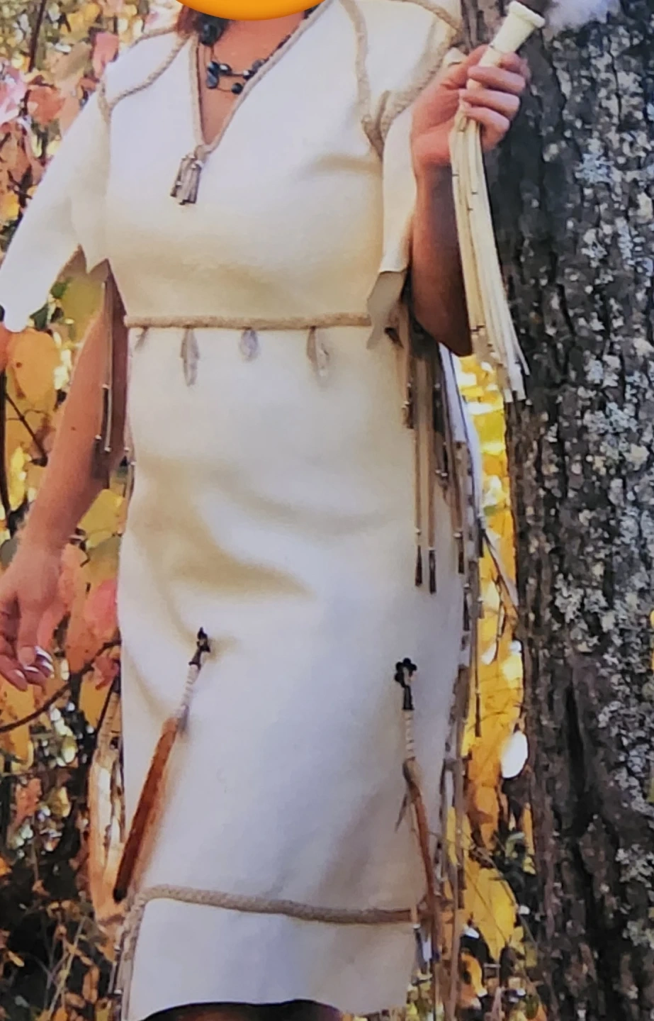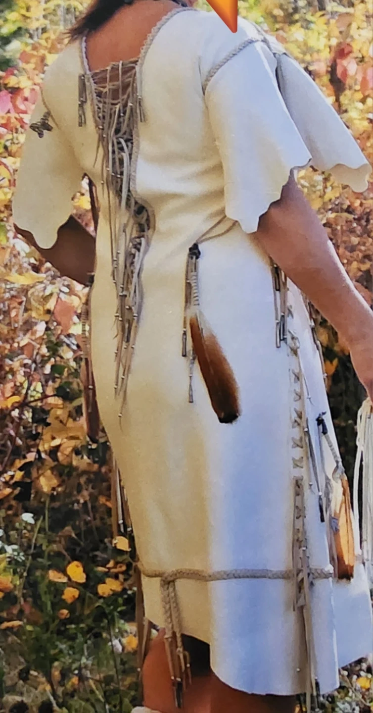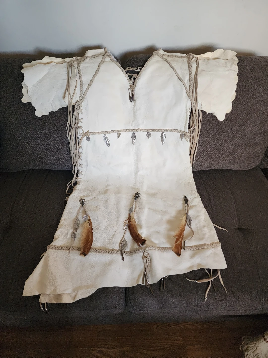 68Beautiful Indigenous style dress with feather and fringe detailing! It appears to be in good condition and would be perfect for cultural events or performances. Home made