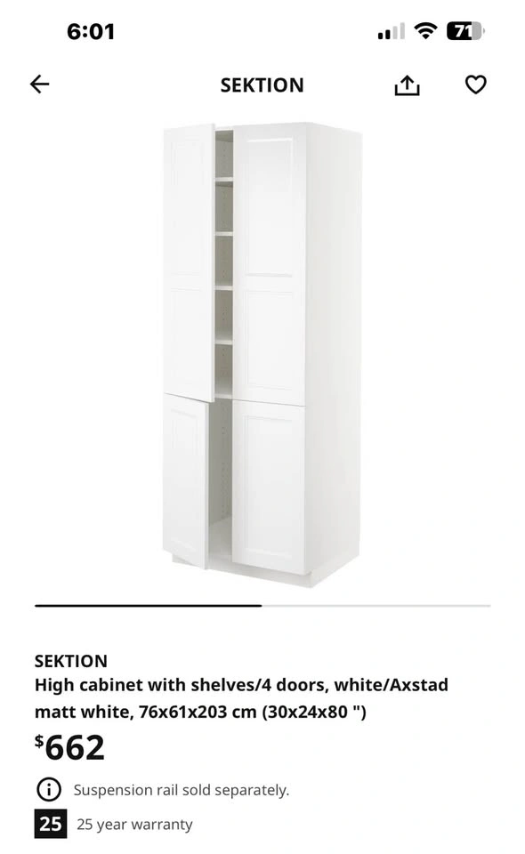 IKEA High Cabinet with Shelves / 4 Doors – $195
