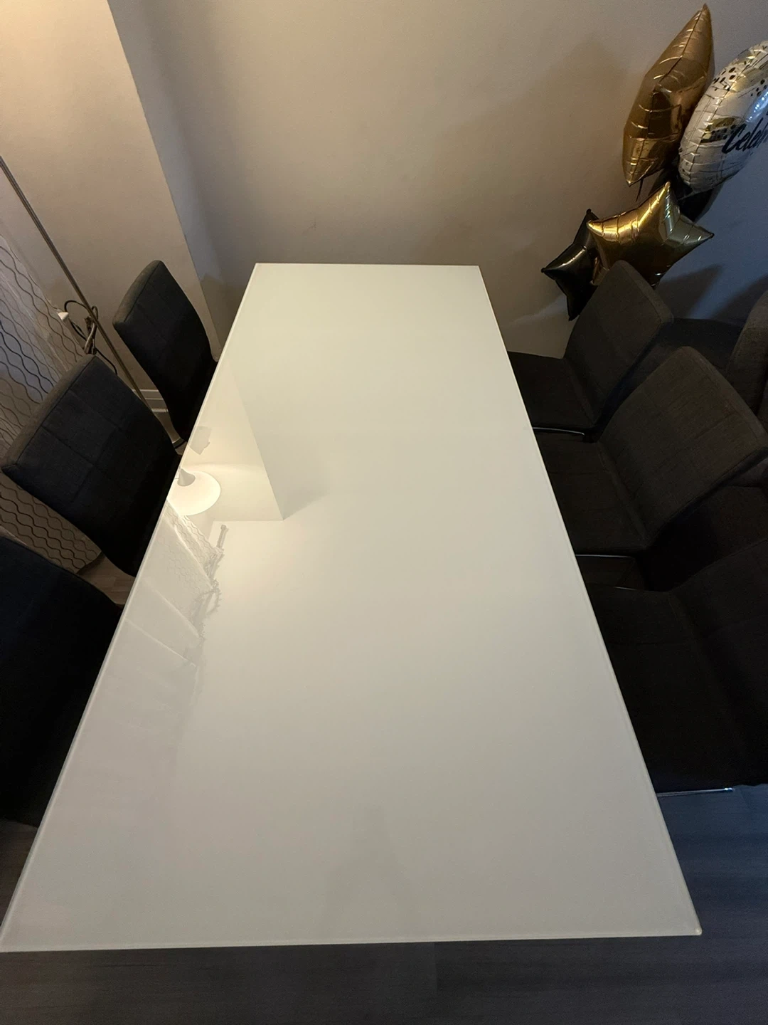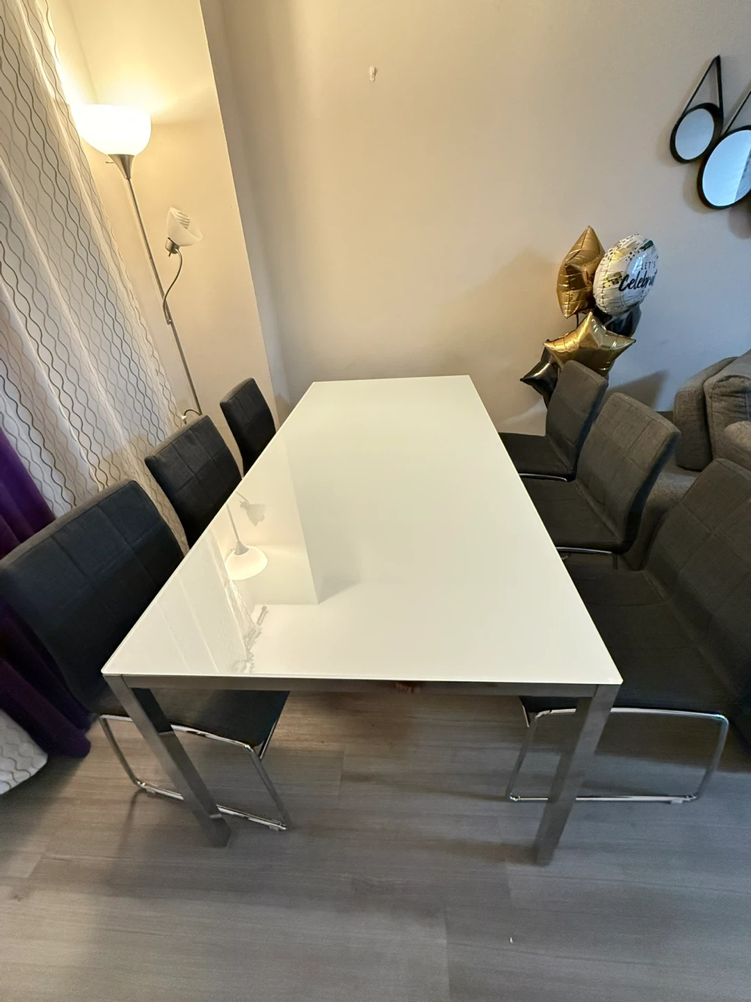 Selling a used white glass top dining table complete with six chairs! The chairs are stylish grey coloured cushioned fabric and have chrome legs. They are in good condition with few stains which can easily be cleaned and ready for a new home!