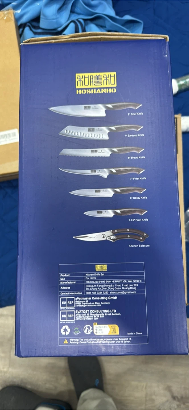 Selling a HOSHANHO knife set that includes a wooden block. The set features various knives: