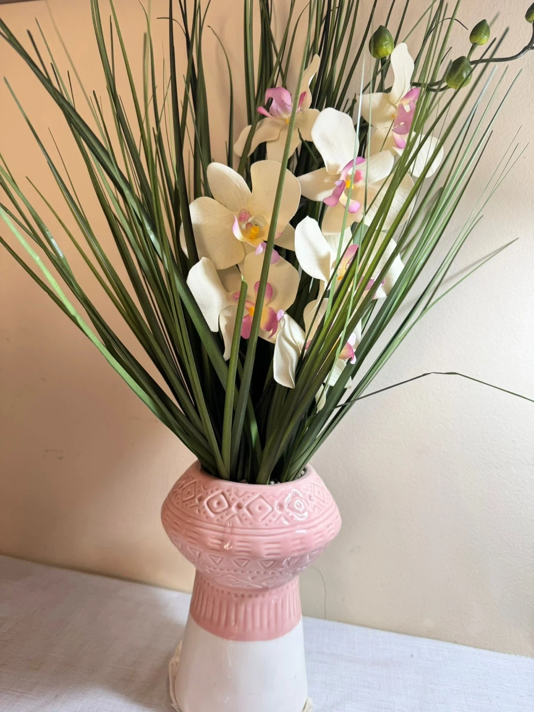 This is a lovely artificial orchid arrangement featuring white orchids with pink accents and tall green grass-like foliage. The vase is a unique pink and white ceramic design. It would make a beautiful addition to any room!