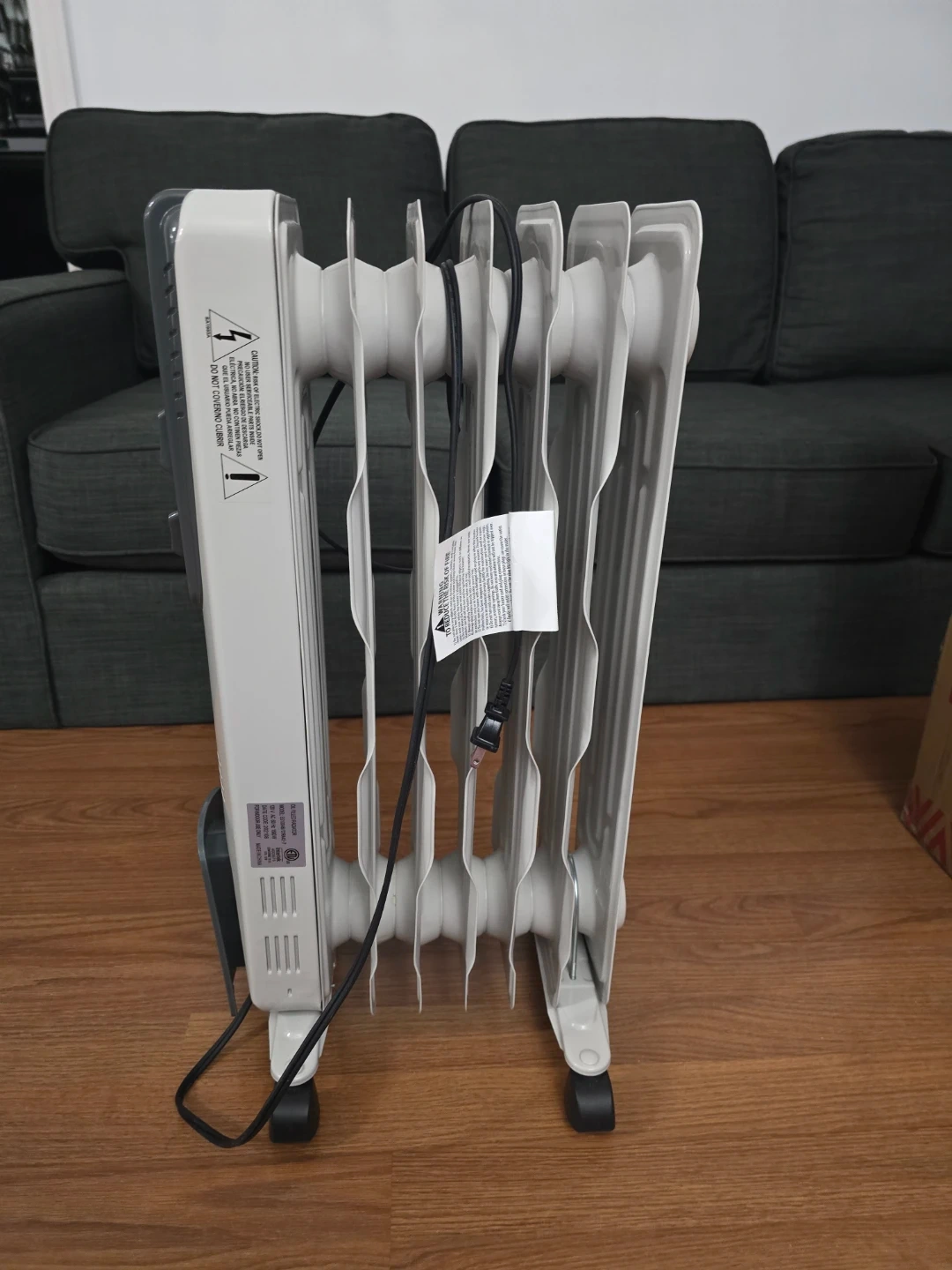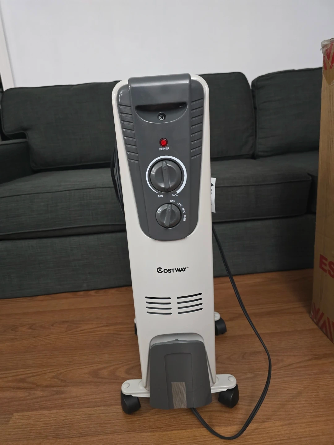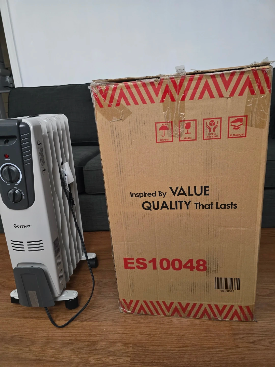 Selling a Costway oil-filled radiator heater, model ES10048. This heater is perfect for indoor use and comes with its original box. It operates at 120V and 60 Hz, with a power rating of 1500W.