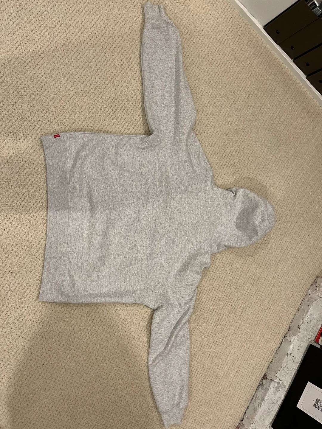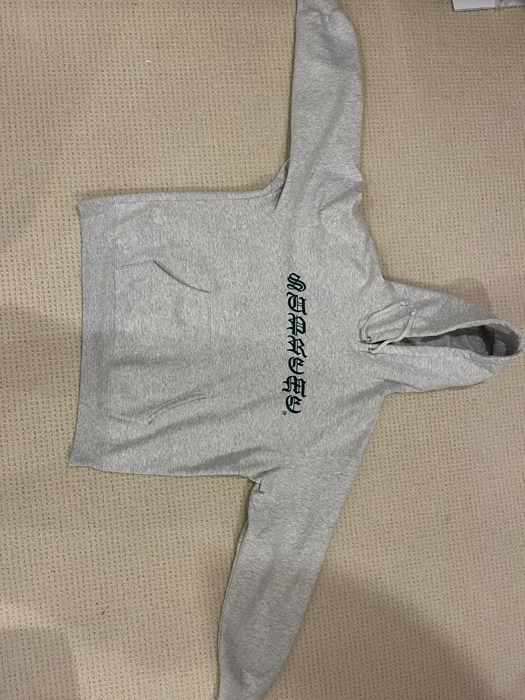 Selling a Supreme hoodie in grey, size large! In great condition. Barely worn. The hoodie features the Supreme logo in an old English font.