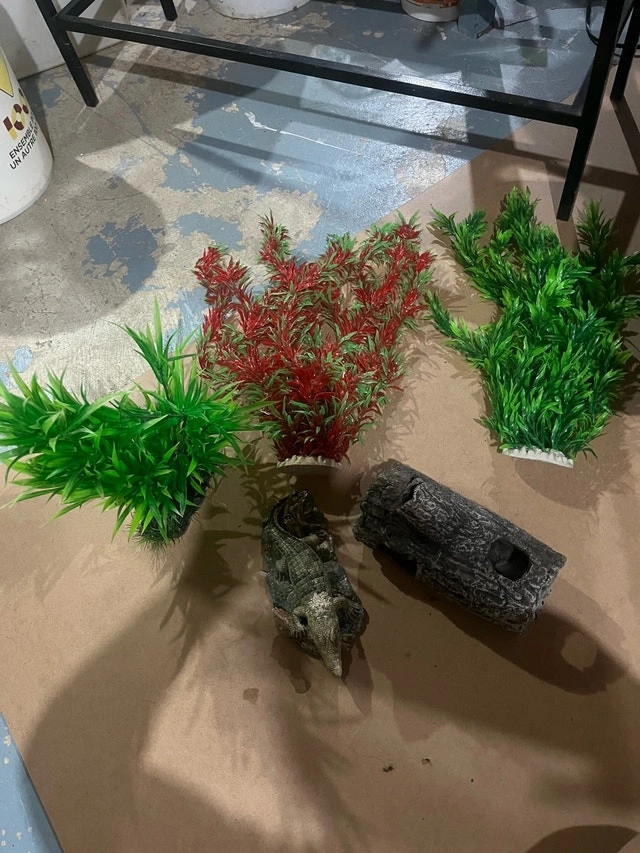 I'm offering a selection of used aquarium decorations to add some flair to your fish's underwater palace! This lot includes artificial plants in green and red, plus a log and a bubble alligator for your aquatic friends to explore. All items are in good condition and ready to be submerged. Here are the specifications: