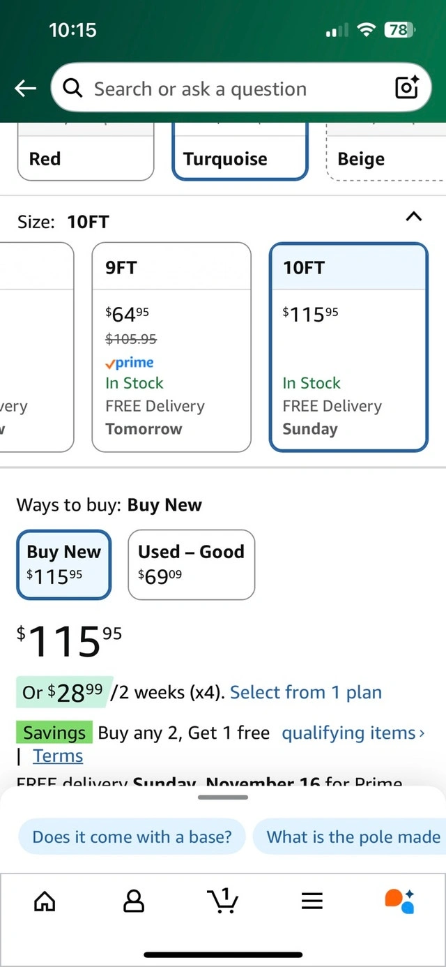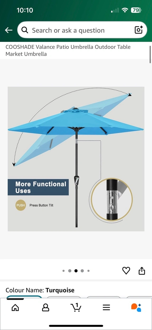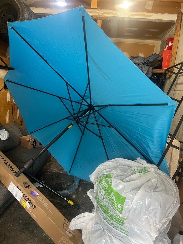 This is new never being used Cooshade 10ft turquoise umbrella, perfect for adding shade to your patio or outdoor space. This umbrella has a push-button tilt feature for adjustable sun coverage. Additional specs include: * Size: 10ft * Colour: Turquoise * Features: Push-button tilt