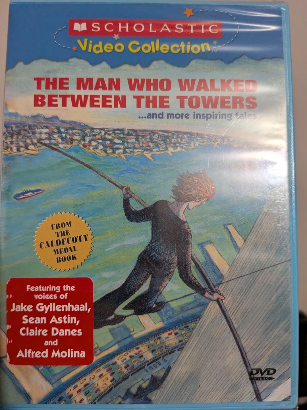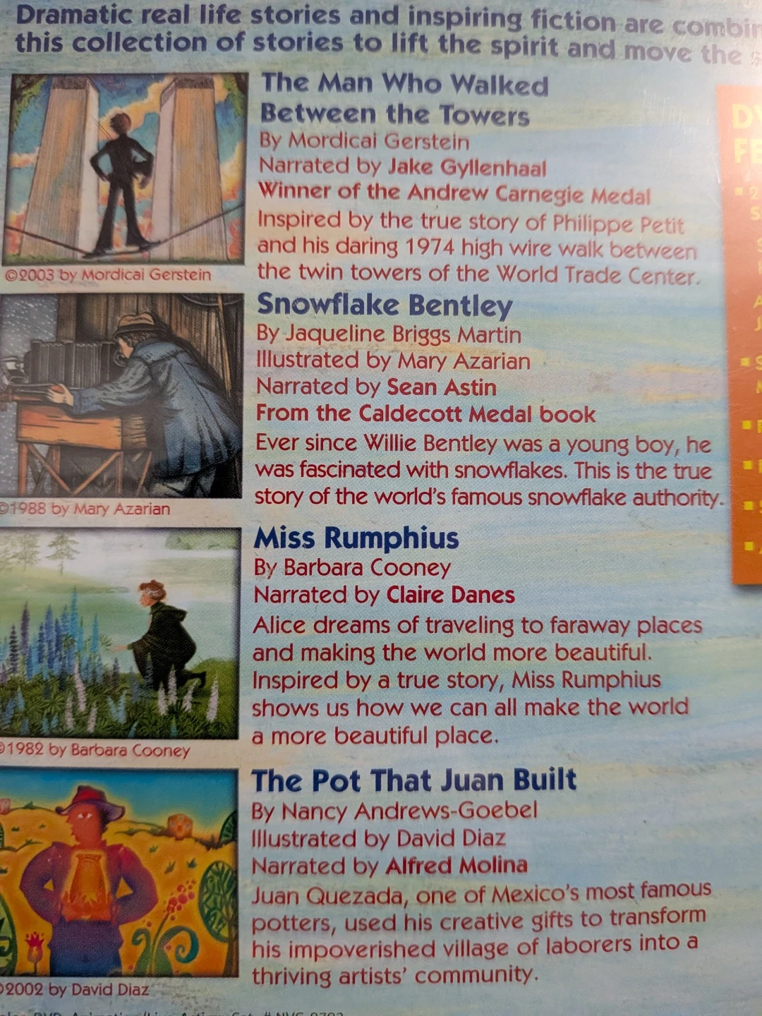 Selling a DVD from the Scholastic Video Collection, titled "The Man Who Walked Between the Towers...and more inspiring tales". This collection features dramatic real-life stories and inspiring fiction. Recommended for ages 5-10. It includes stories narrated by Jake Gyllenhaal, Sean Astin, Claire Danes, and Alfred Molina. Total running time is approximately 72 minutes