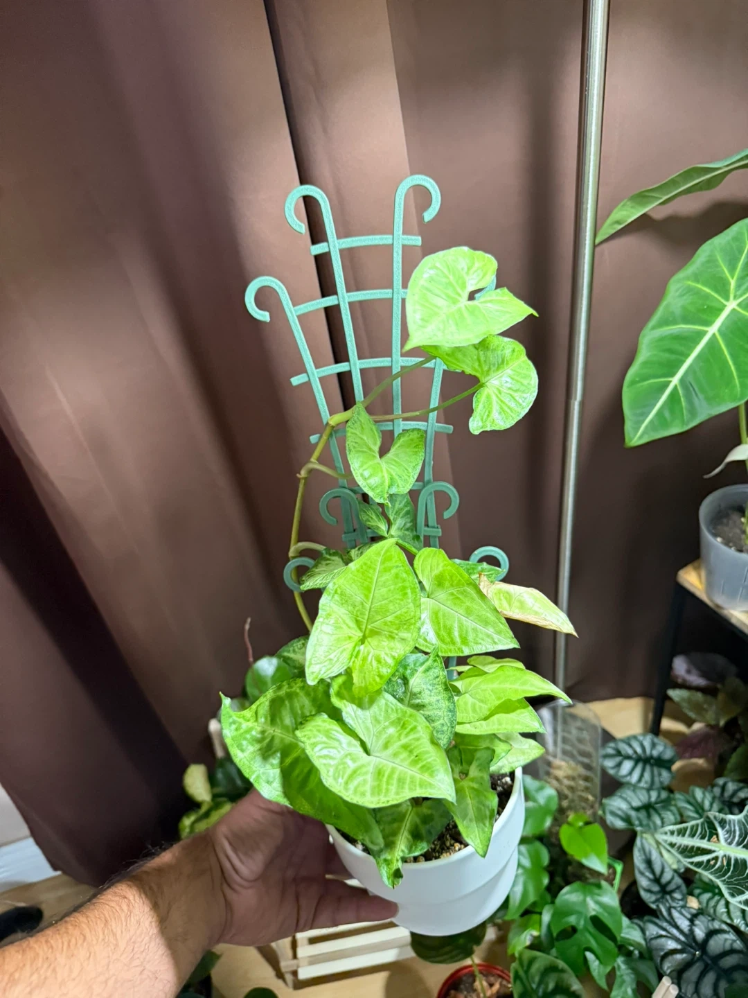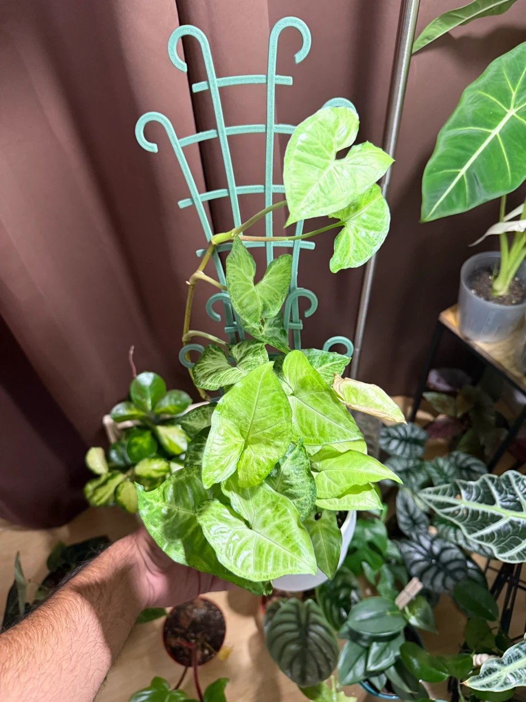 Selling a healthy syngonium plant. It comes with a cute trellis to help it climb and grow! The plant is a vibrant green and will add a touch of nature to any space