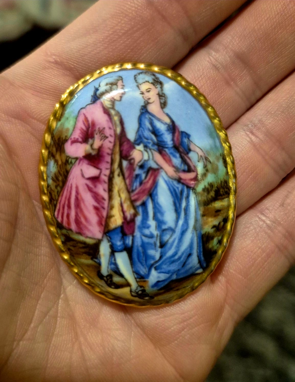 Selling a lovely Aynsley Fine Bone China brooch! It features a romantic scene with a couple in Victorian-esque clothing. The brooch has a gold-tone finish around the edge and is in great condition.