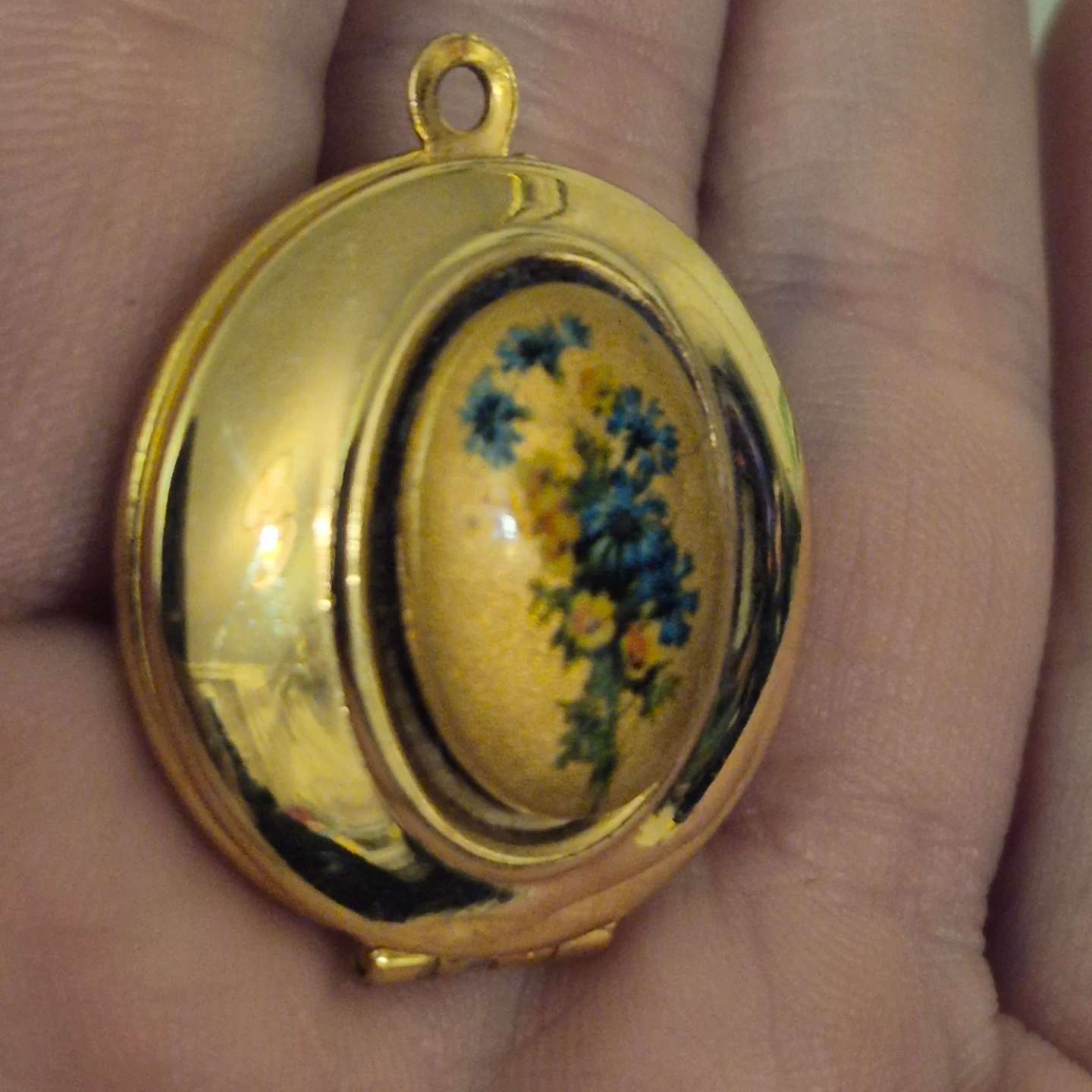 Hand picked/Curated a vintage gold-tone locket pendant. It features a delicate blue and green floral design on the front. It's in good condition and would make a lovely addition to any jewellery collection.