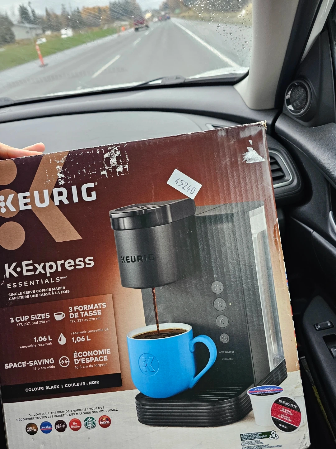 Selling a Keurig K-Express Essentials single serve coffee maker in black! It's space-saving at 16.5 cm wide and can brew 3 cup sizes: 177, 237, and 296 ml. It also has a 1.06 L removable reservoir. Enjoy your favourite coffee brands with this compact machine!