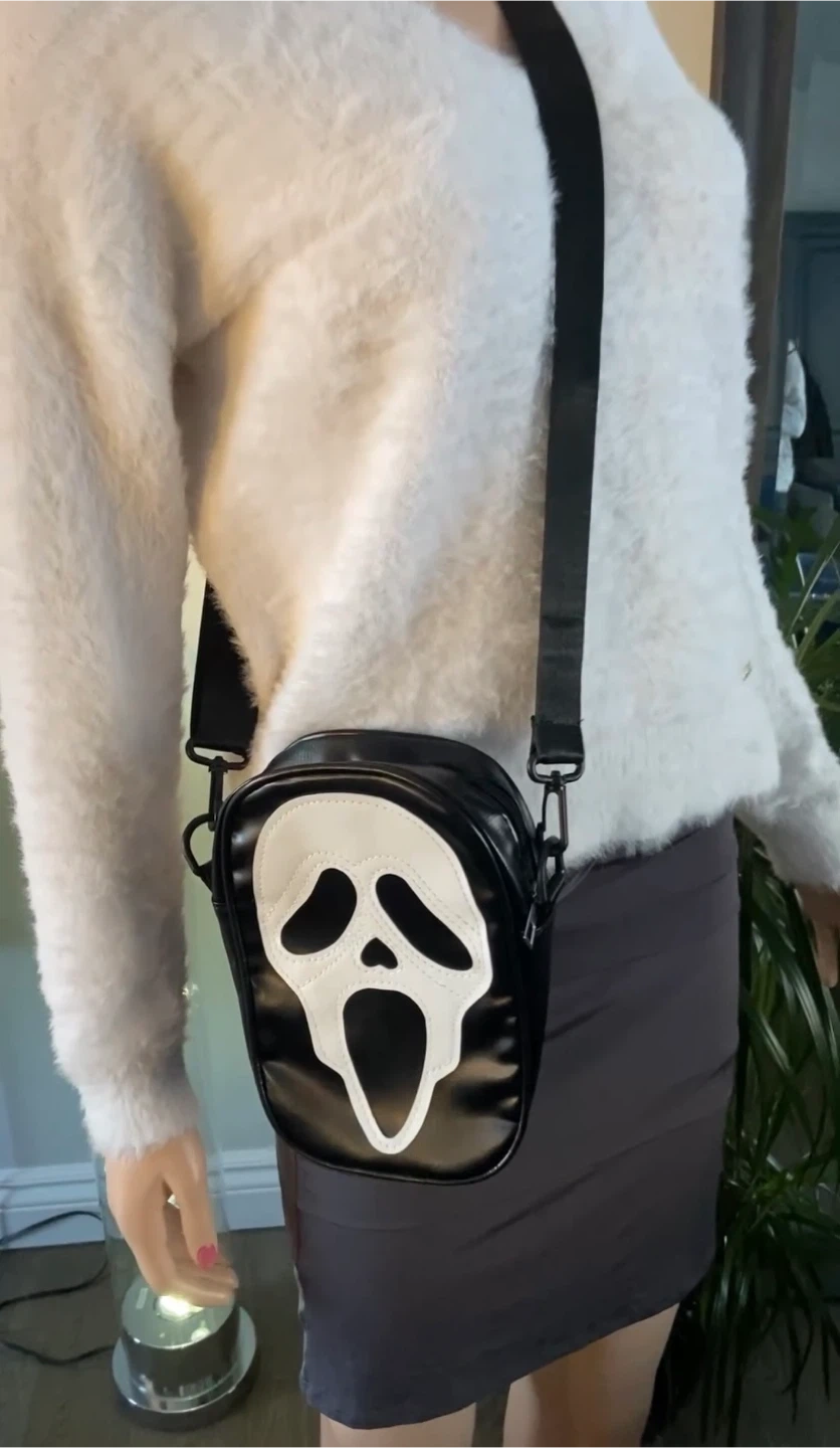 Cute Scream Ghostface crossbody bag! Perfect for any horror fan. The bag is black with a white Ghostface design on the front. It has a black adjustable strap. New and smk-free