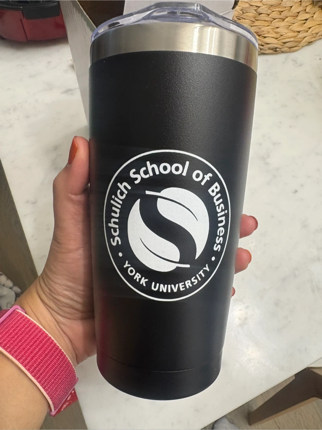 I'm selling a tumbler from Schulich School of Business at York University. It's black with the school's logo on it. Perfect for keeping your drinks hot or cold.