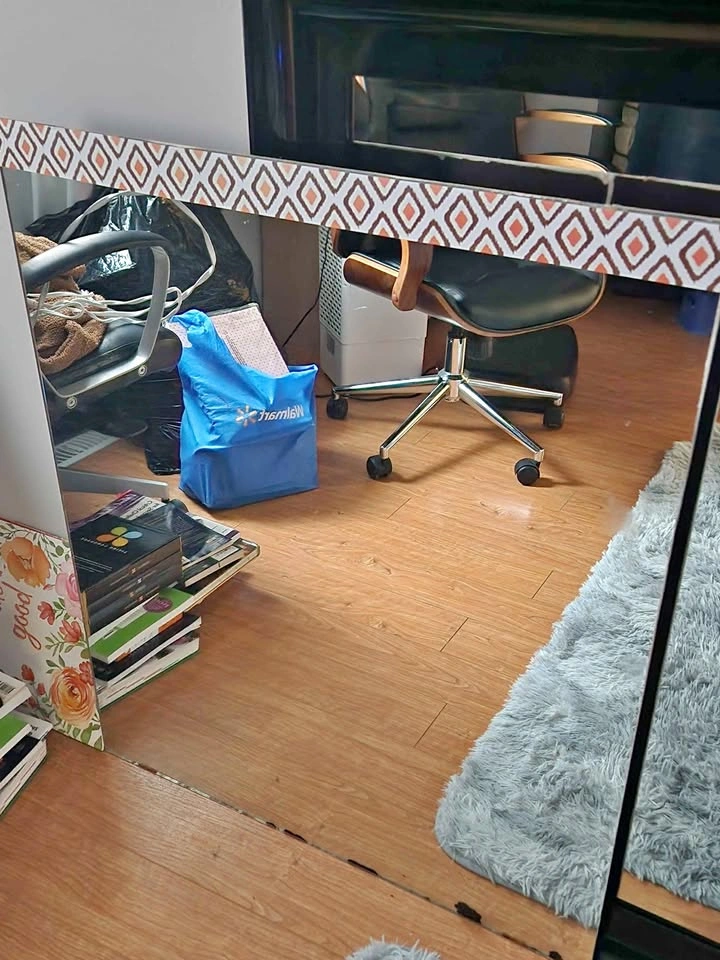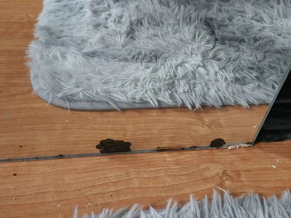 There are black spots in the mirror at the bottom and a tape border that can be removed at the top.