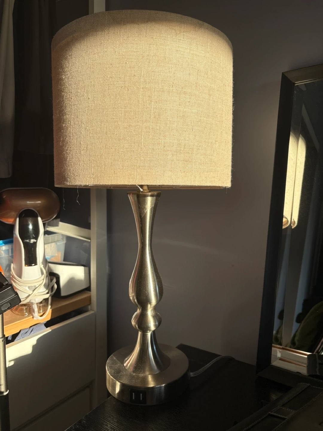 Selling a table lamp 2 lamps $70 each with a built-in USB port! It's in great condition and perfect for a bedside table or desk. The lamp has a neutral-toned shade and a metallic base, making it a stylish addition to any room