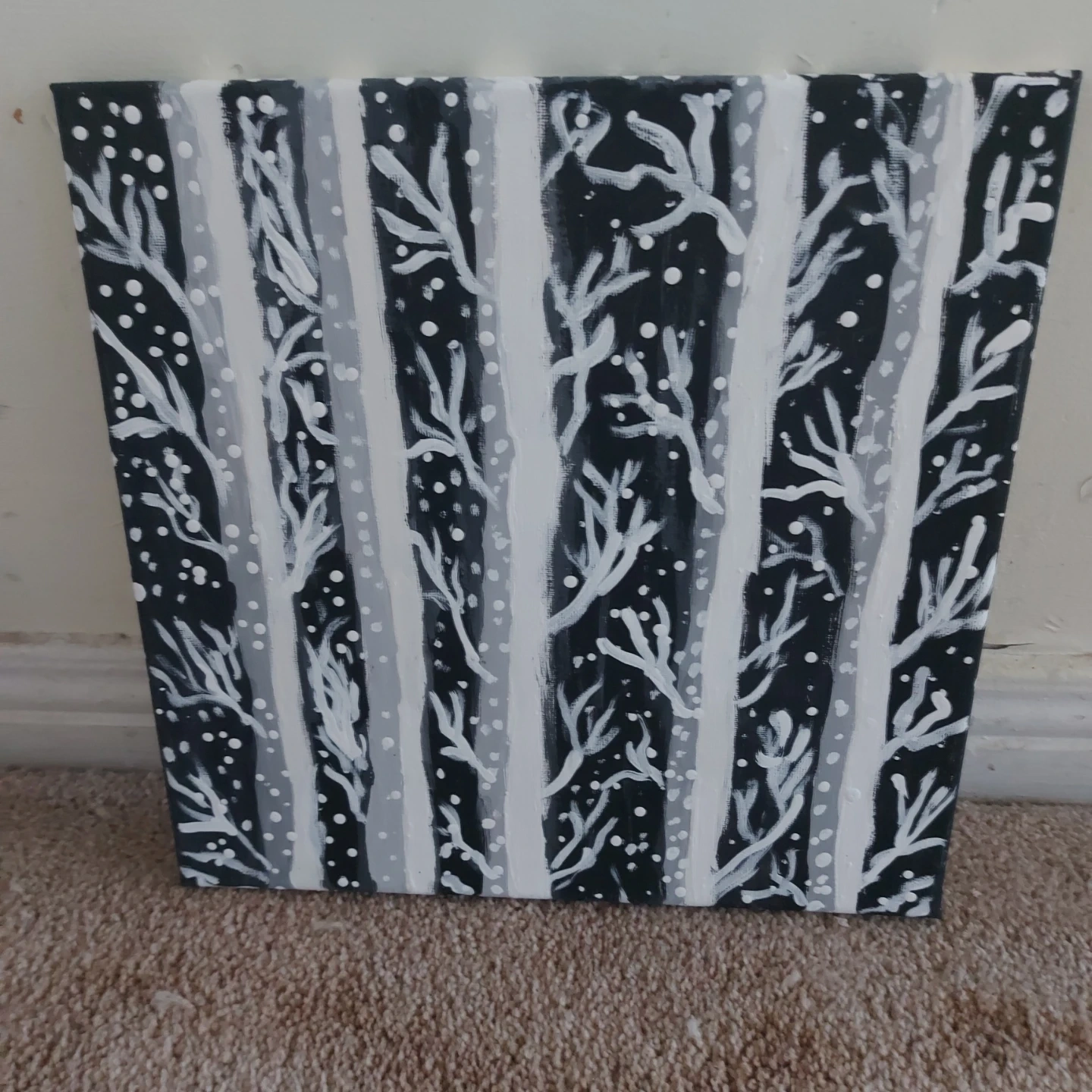 Canvas art featuring a hand-painted winter scene with trees and snow. The painting is done in shades of black, white, and grey. It's in great condition and would be a lovely addition to any room!